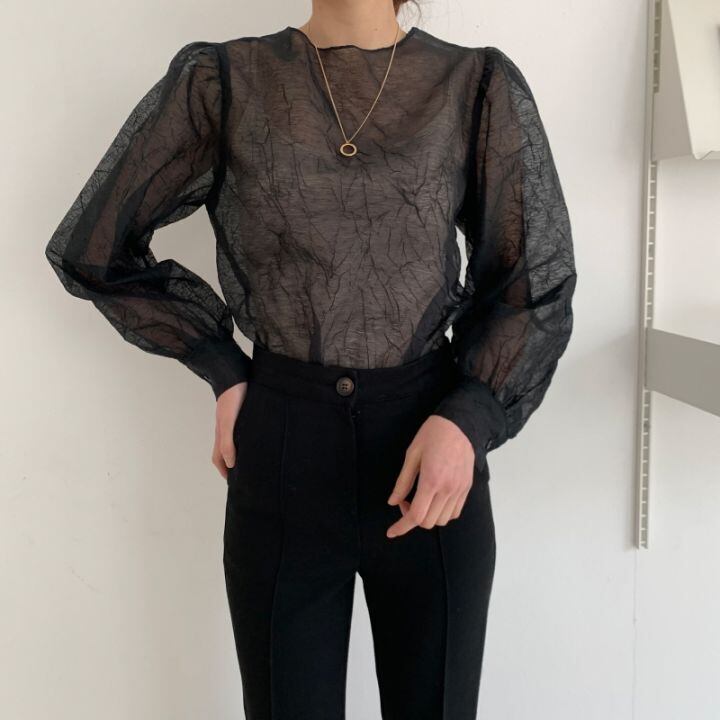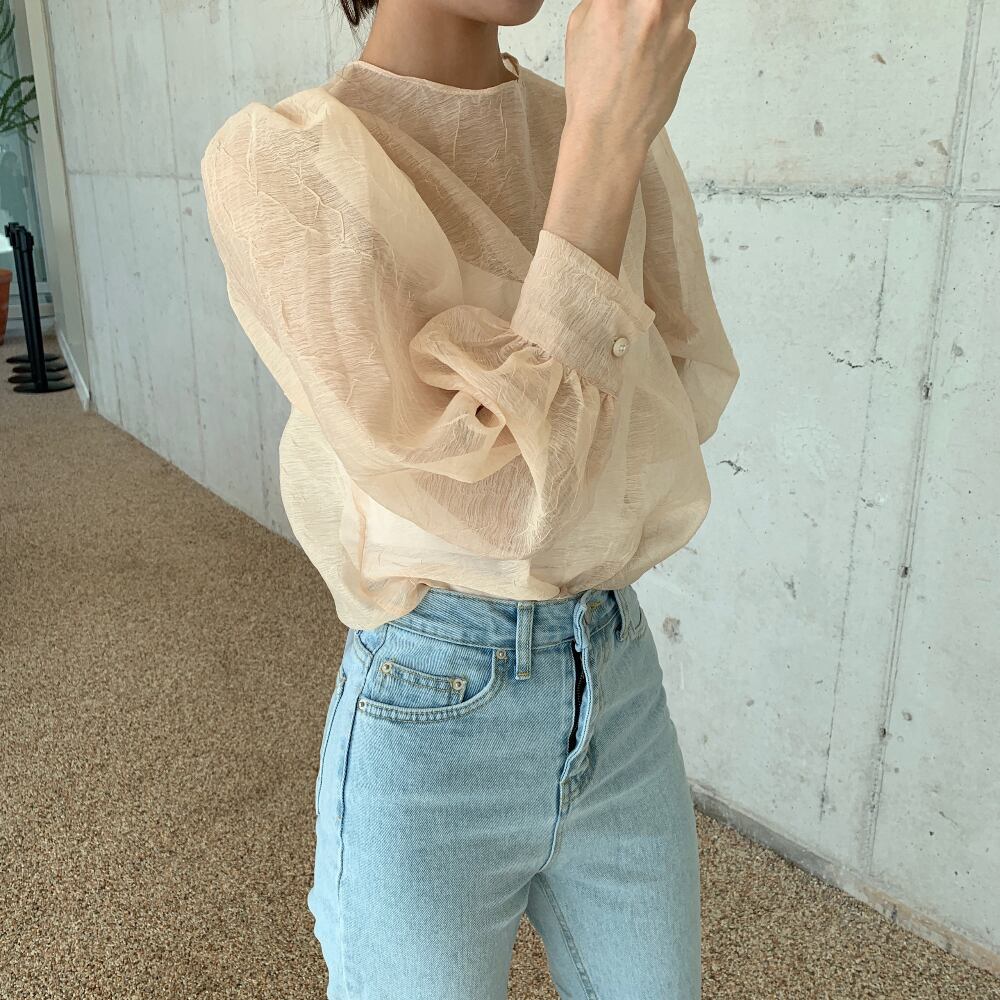 トップス カットソー シャツ シフォン シアー 透け感 長袖 レディース ランタンスリーブ ボリューム エレガント 上品 清楚 高級感 きれいめ かわいい 大人可愛い ガーリー フェミニン カジュアル お洒落 オシャレ ゆったり 体型カバー 着痩せ ベージュ ホワイト ブラック 黒 無地 韓国 トレンド 流行 春 夏 秋 20代 30代 40代 着回し 重ね着 デート 女子会 モテ 映え とろみ 抜け感 こなれ感 映え SNS 華奢 清潔感 セクシー 大人 20代 30代 40代 50代 しわ ワッシャー