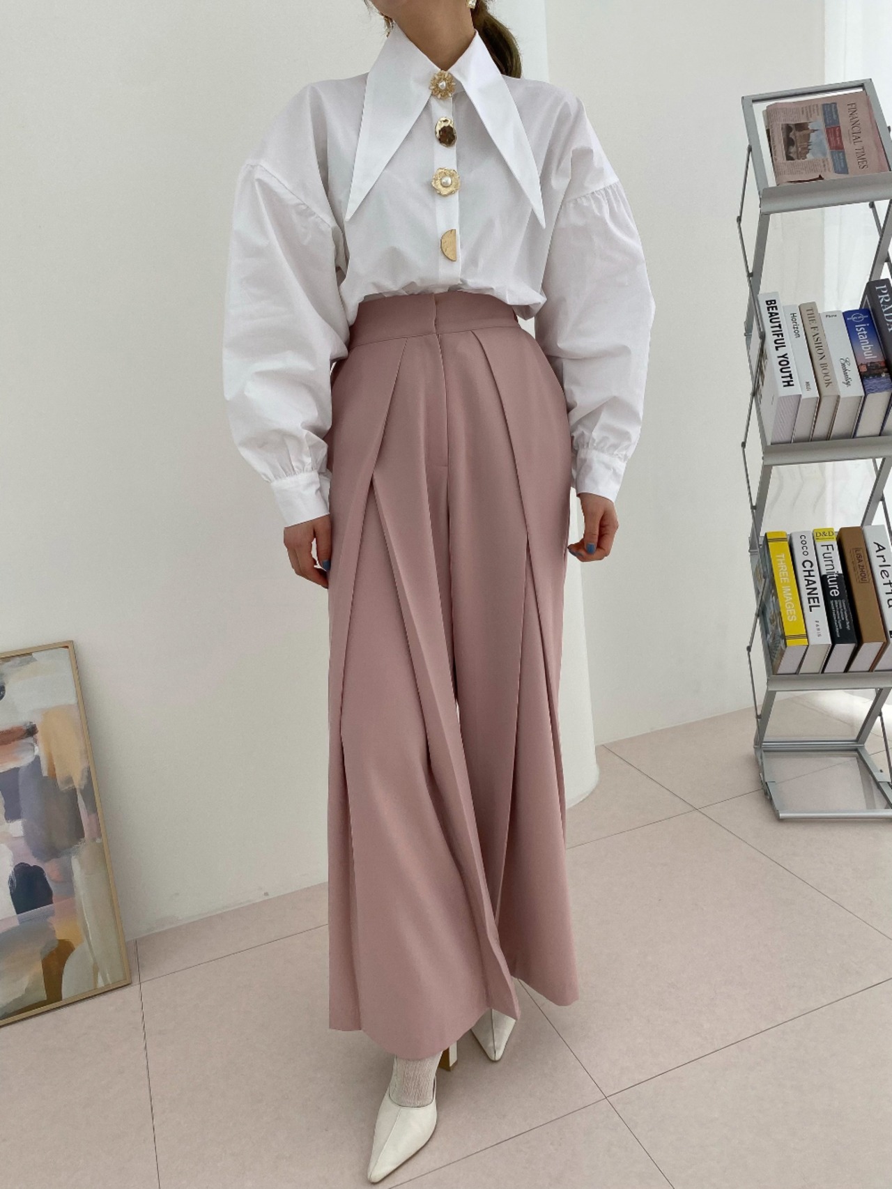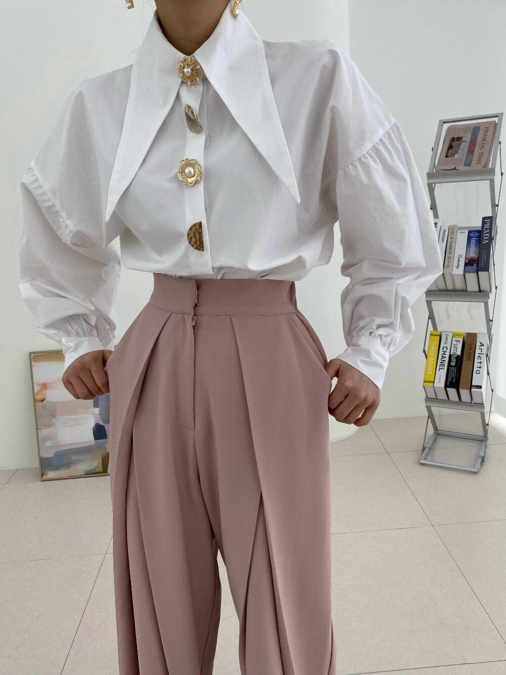 ビッグカラーと大きなボタンが素敵なシャツ。