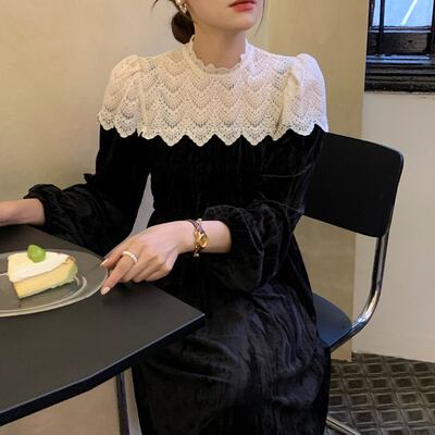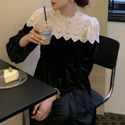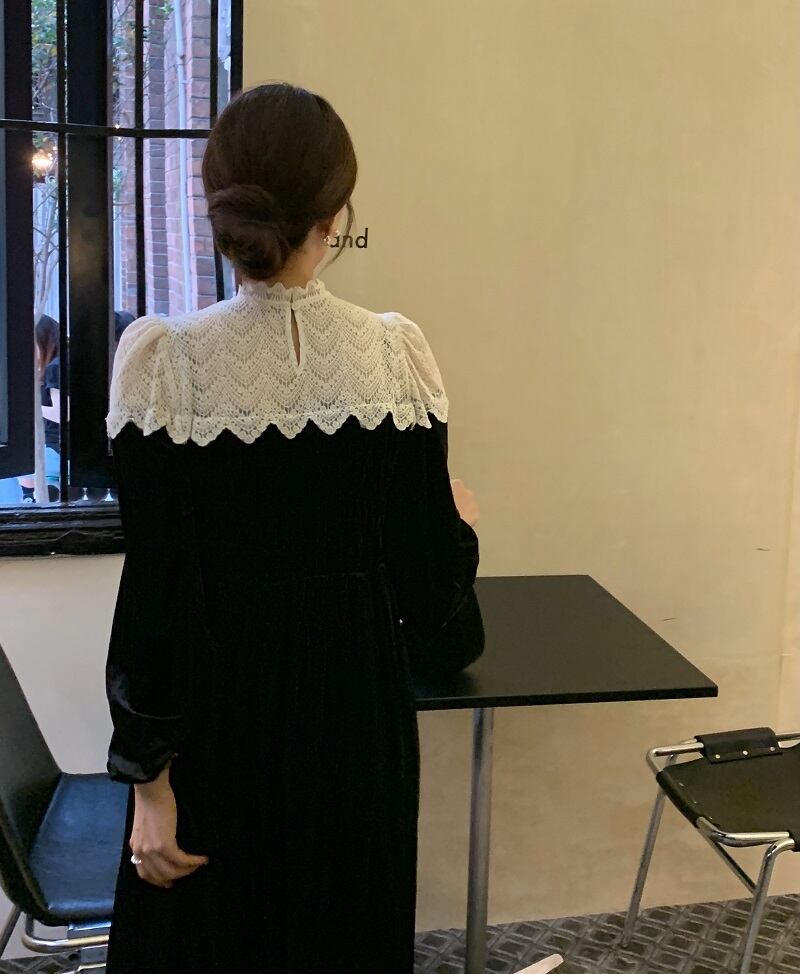 ワンピース 切り替え レース ロング丈 ミモレ丈 長袖 レディース 総レース ベロア エレガント 上品 清楚 高級感 きれいめ かわいい 大人可愛い カジュアル お洒落 オシャレ ゆる ゆったり 大きめ 着痩せ 黒 ブラック 無地 韓国 トレンド 流行 春 秋 冬 レトロ ヴィンテージ アンティーク 20代 30代 40代 50代 デート 女子会 モテ 映え こなれ感 華奢 スカラップ 肌見せ 異素材 ドレス パーティー お呼ばれ 個性的 個性派 楽ちん シック モダン 体型カバー 主役 存在感