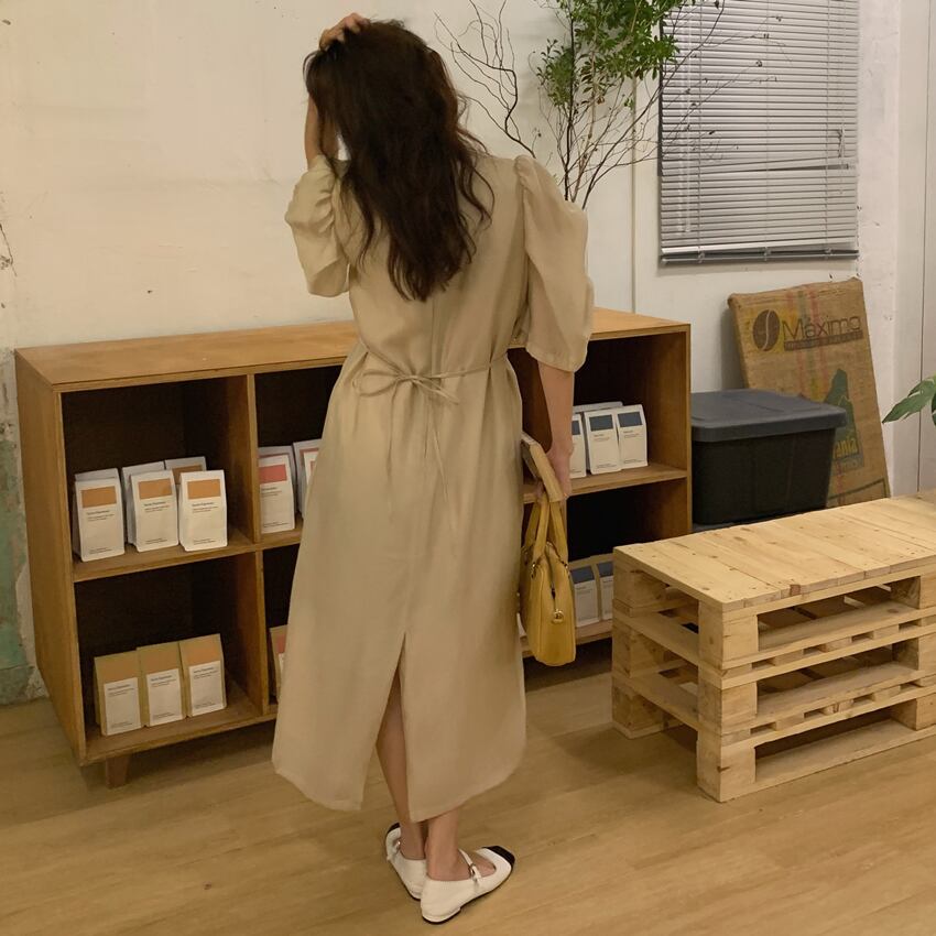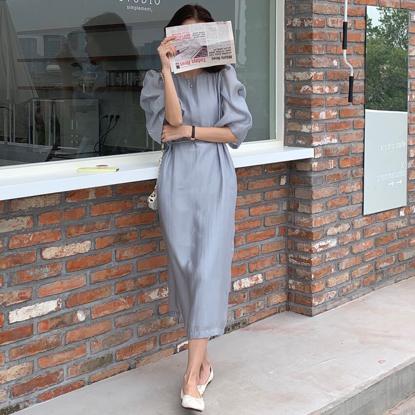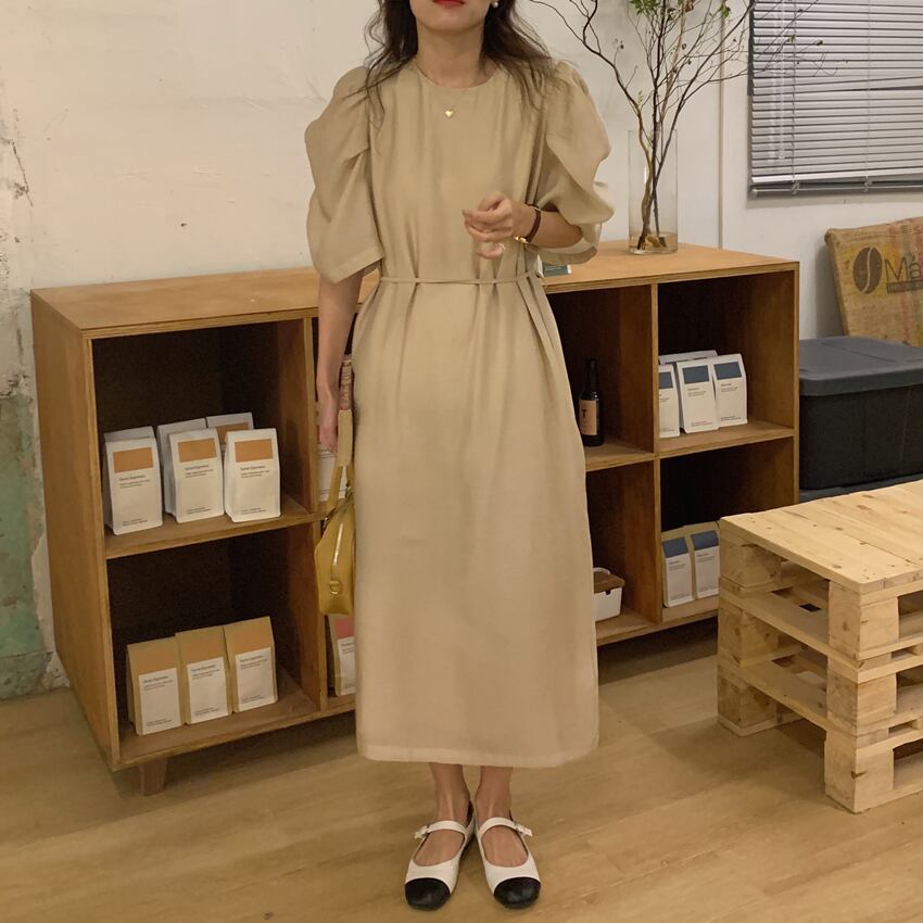 夏 フランス ドレス オールインワン ロングスカート ワンピドレス ロング丈 袖あり 半袖 パフスリーブ ラウンドネック 襟なし 細身 ベルト ふわふわ 透け感 ボタン ポリエステル 薄手 普通生地(春夏用) 大人可愛い シンプル 大人 上品 おしゃれ 大人女子 キュート エレガント 無地 夏 10代 20代 レディース 女性用 ママ マタニティ 女の子 OL 通勤 学生 通学 お出かけ お泊まり イベント レストラン 着回し ファッション 楽ちん インスタ映え ワンサイズ 画像1 画像2 画像3