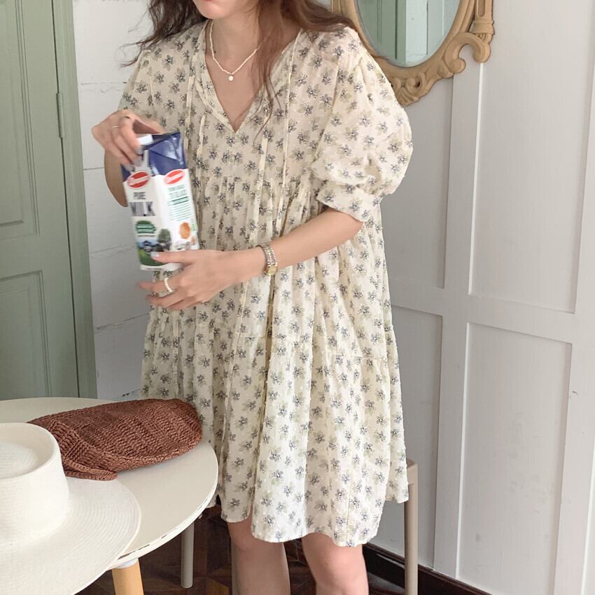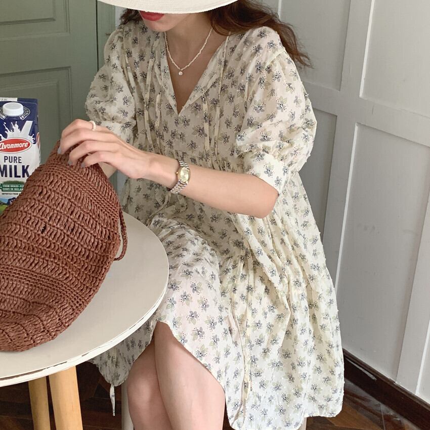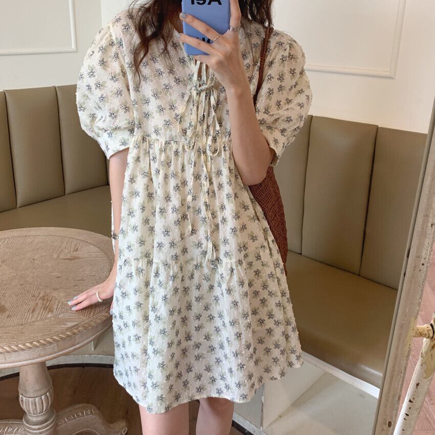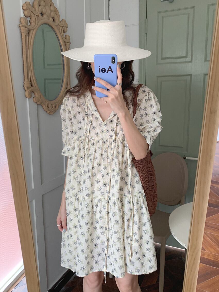 夏 フラワー ルーズ ドレス ショートスカート プリーツスカート ワンピドレス ショート丈 袖あり 半袖 パフスリーブ Vネック 襟付き リボン ふわふわ 透け感 ルーズウエスト 薄手 異素材MIX 普通生地(春夏用) かわいい 大人可愛い シンプル カジュアル お洒落 レトロ 大人女子 こなれ感 ラブリー モダン 花柄 夏 レディース 女性用 ママ マタニティ 女の子 OL 通勤 学生 通学 お出かけ 休日 リゾート レストラン 普段使い スタイル 楽ちん インスタ映え ワンサイズ アプリコット