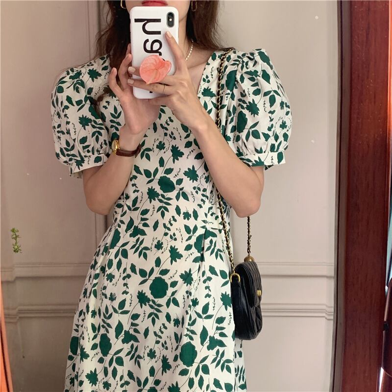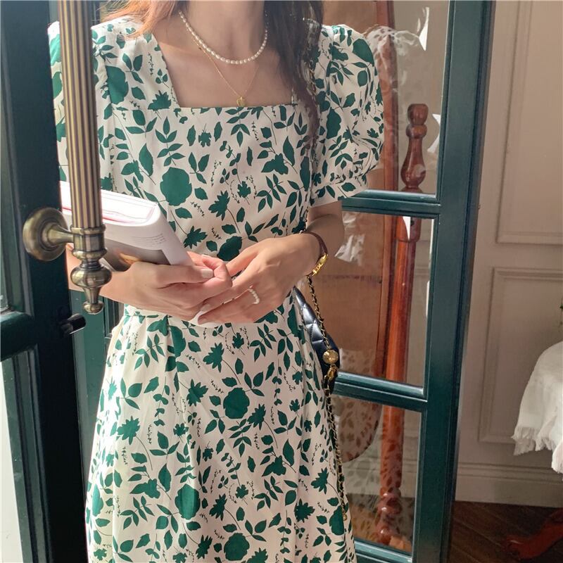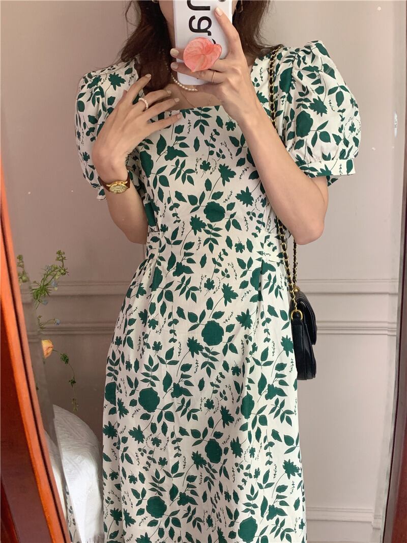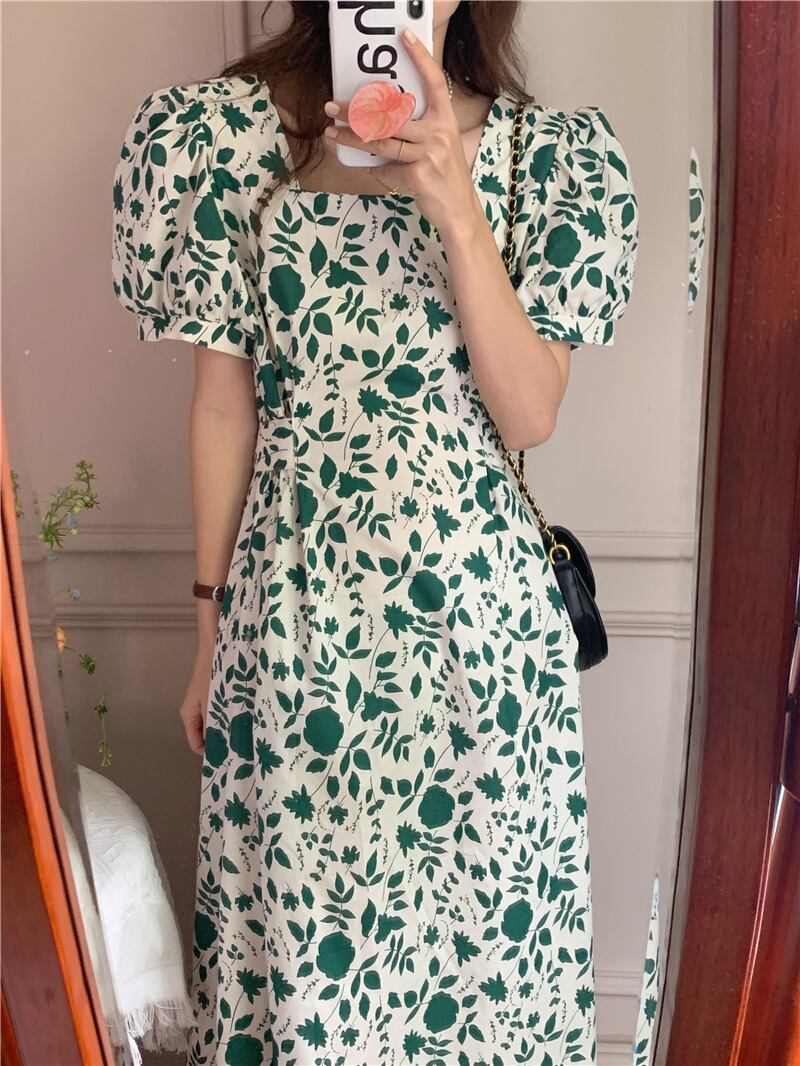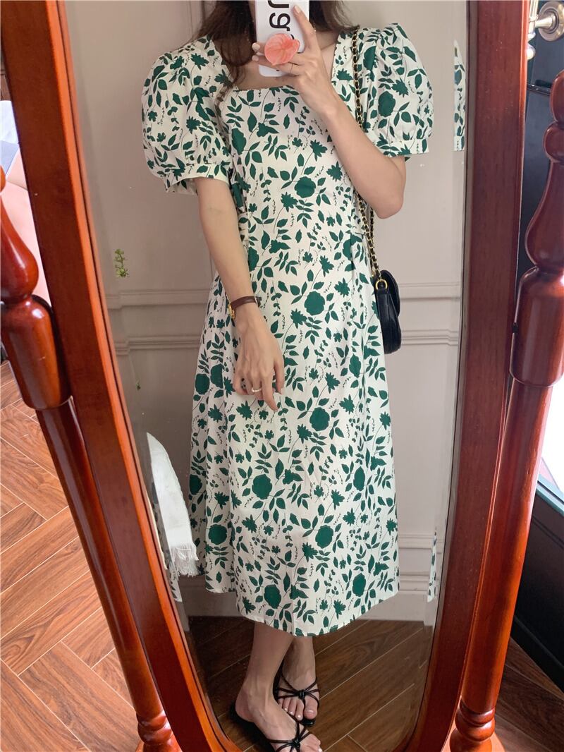 夏 フラワー ドレス ワンピース ミディスカート ワンピドレス ミディアム丈 袖あり 半袖 パフスリーブ スクエアネック 襟なし レギュラー リボン ベルト 透け感 薄手 普通生地(春夏用) ツーピース かわいい 大人可愛い シンプル お洒落 エキゾチック 大人女子 こなれ感 キュート モダン 無地 夏 10代 20代 レディース 女性用 ママ マタニティ 女の子 オフィス ビジネス OL 通勤 学生 通学 デート 女子会 パーティー ガーデン 着回し ファッション インスタ映え ワンサイズ グリーン