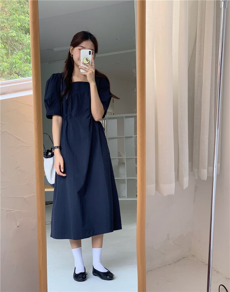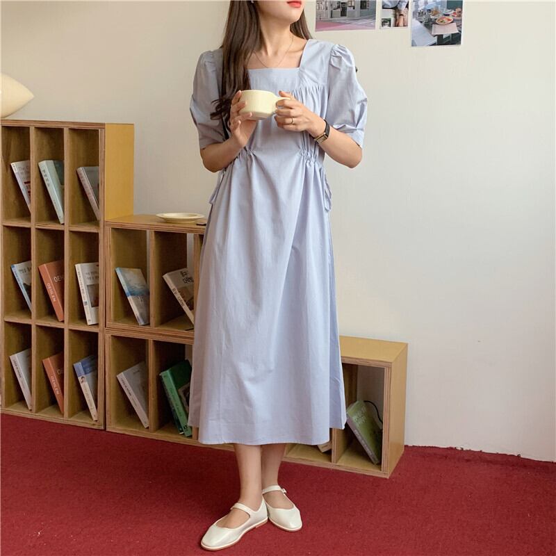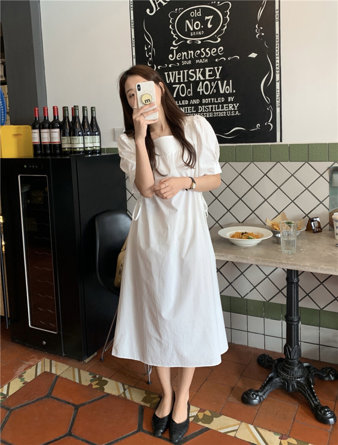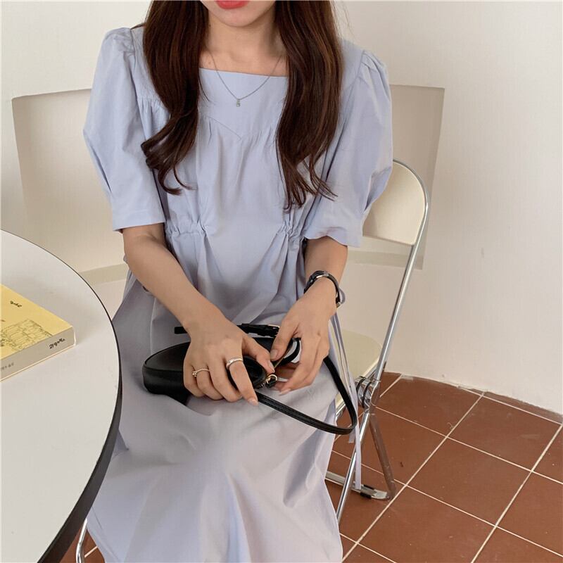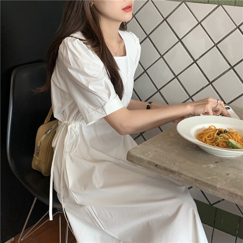 夏 フレンチ ロングスカート ワンピース ロングスカート ミモレ丈 袖あり 半袖 パフスリーブ スクエアネック 襟なし スリム レギュラー レース ハイウエスト 透け感 薄手 普通生地(春夏用) ツーピース かわいい 大人可愛い お洒落 大人女子 ラブリー モダン 無地 夏 10代 20代 レディース 女性用 ママ マタニティ 女の子 オフィス ビジネス OL 通勤 学生 通学 お泊まり 休日 リゾート ホテル 普段使い ファッション 楽ちん インスタ映え ワンサイズ ホワイト ブルー ダークブルー