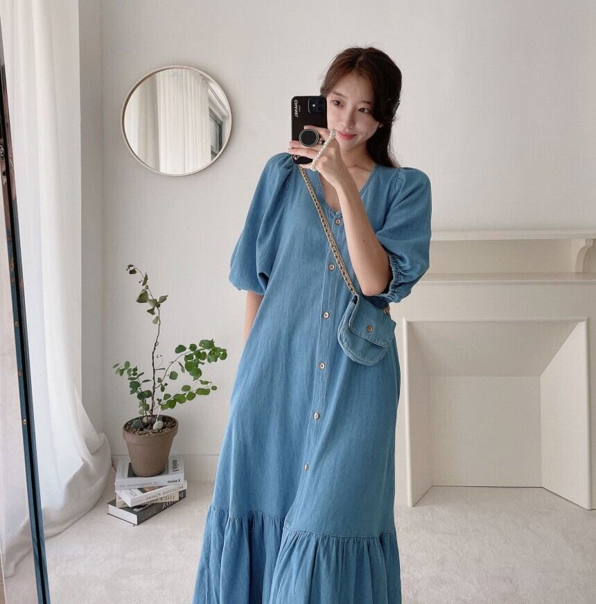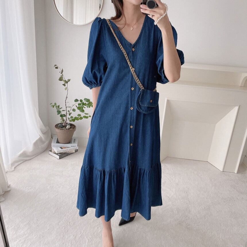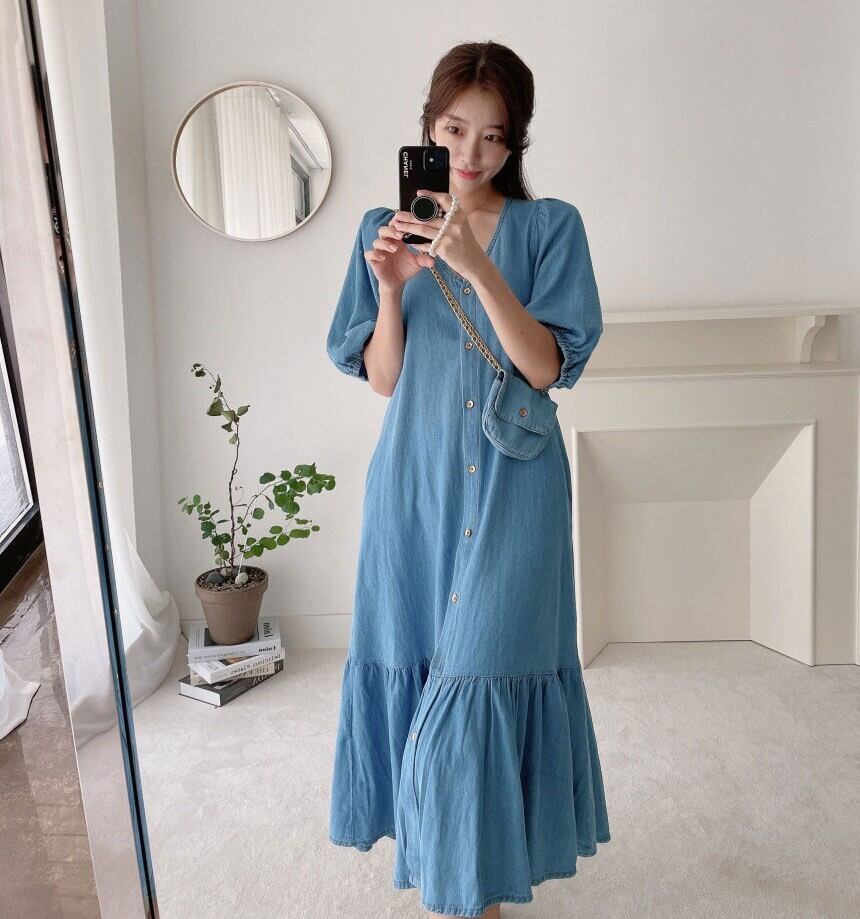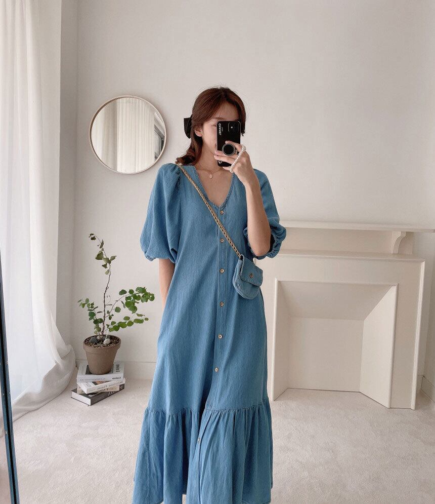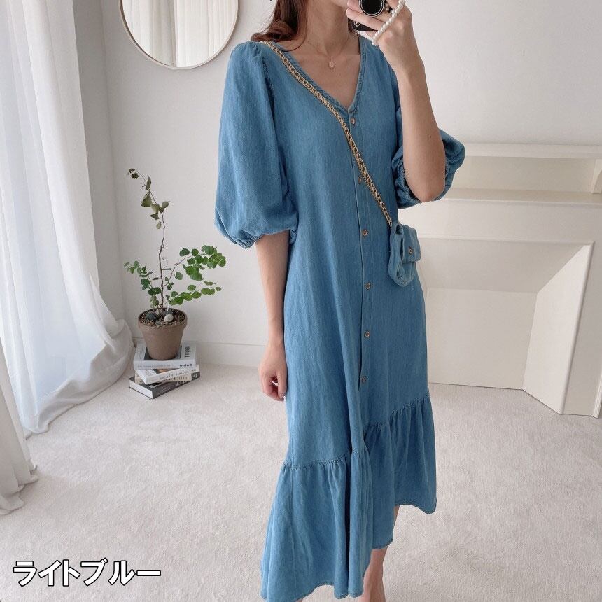 ワンピース レディース デニムワンピ シャツワンピ ロングワンピ ワンサイズ フリーサイズ ライトブルー ダークブルー インディゴ 青 デニム ド無地 大人カラー 春 夏 秋 5分袖 五分袖 半袖 パフスリーブ Vネック フロントボタン ロング丈 ミドル丈 ミモレ丈 膝下 フレア Aライン 裾フリル ゆったり ゆる ルーズ 着やせ 体型カバー ママ フェミニン きれいめ きれカジ カジュアル ガーリー キュート 大人 大人可愛い 存在感 主役級 こなれ感 ぬけ感 お出かけ デート 韓国 オルチャン レトロ