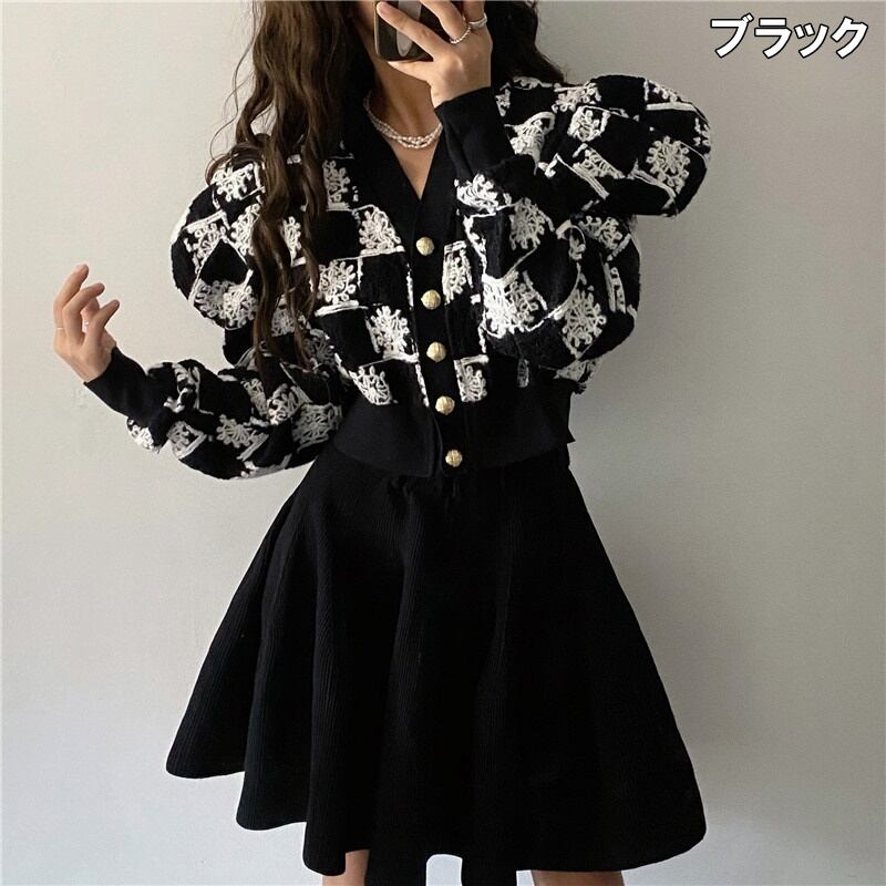 セットアップ レディース セット 2点セット ツーピース ワンサイズ フリーサイズ キャメル ブラック 黒 大人カラー バイカラー トップス ニット カーディガン 長袖 Vネック ショート丈 ショート クロップド丈 パワショル ボリューミー ボトムス スカート ミニスカート ハイウエスト 脚長 美脚 フレア Aライン フェミニン ナチュラル 大人 大人可愛い きれいめ きれカジ カジュアル モード スタイリッシュ シック クール 個性 ユニーク 派手 着回し こなれ感 存在感 主役級 韓国 オルチャン