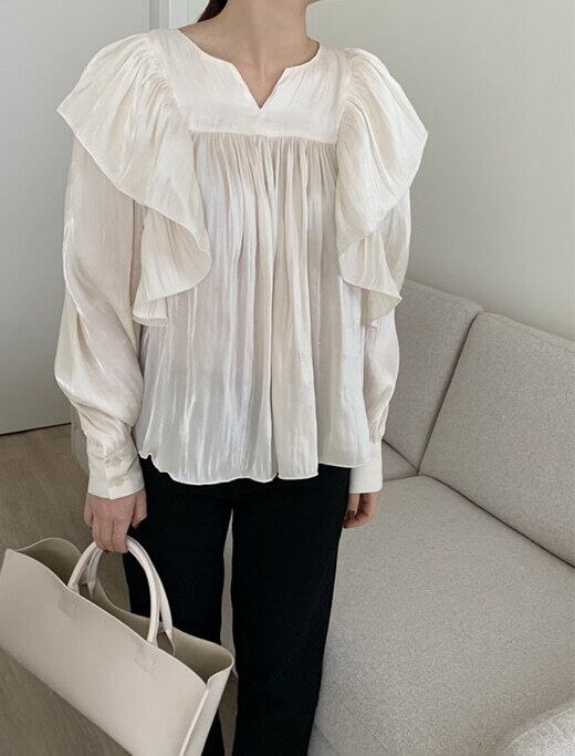 肩から流れる大きめフリルがエレガントなブラウスです。