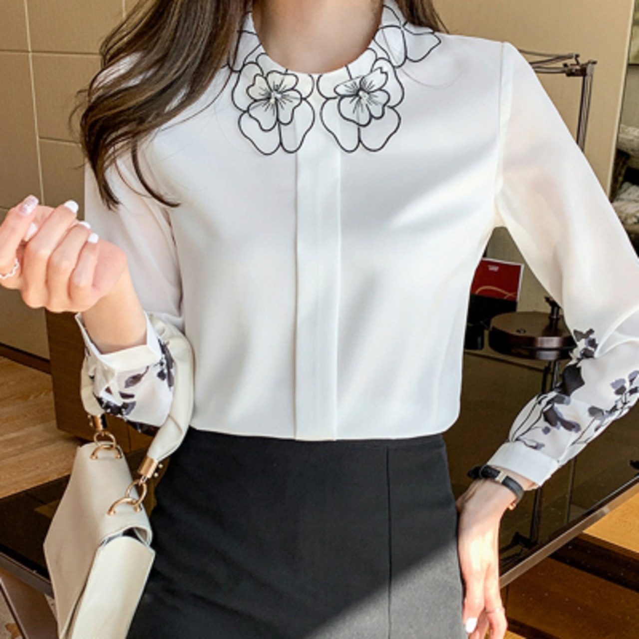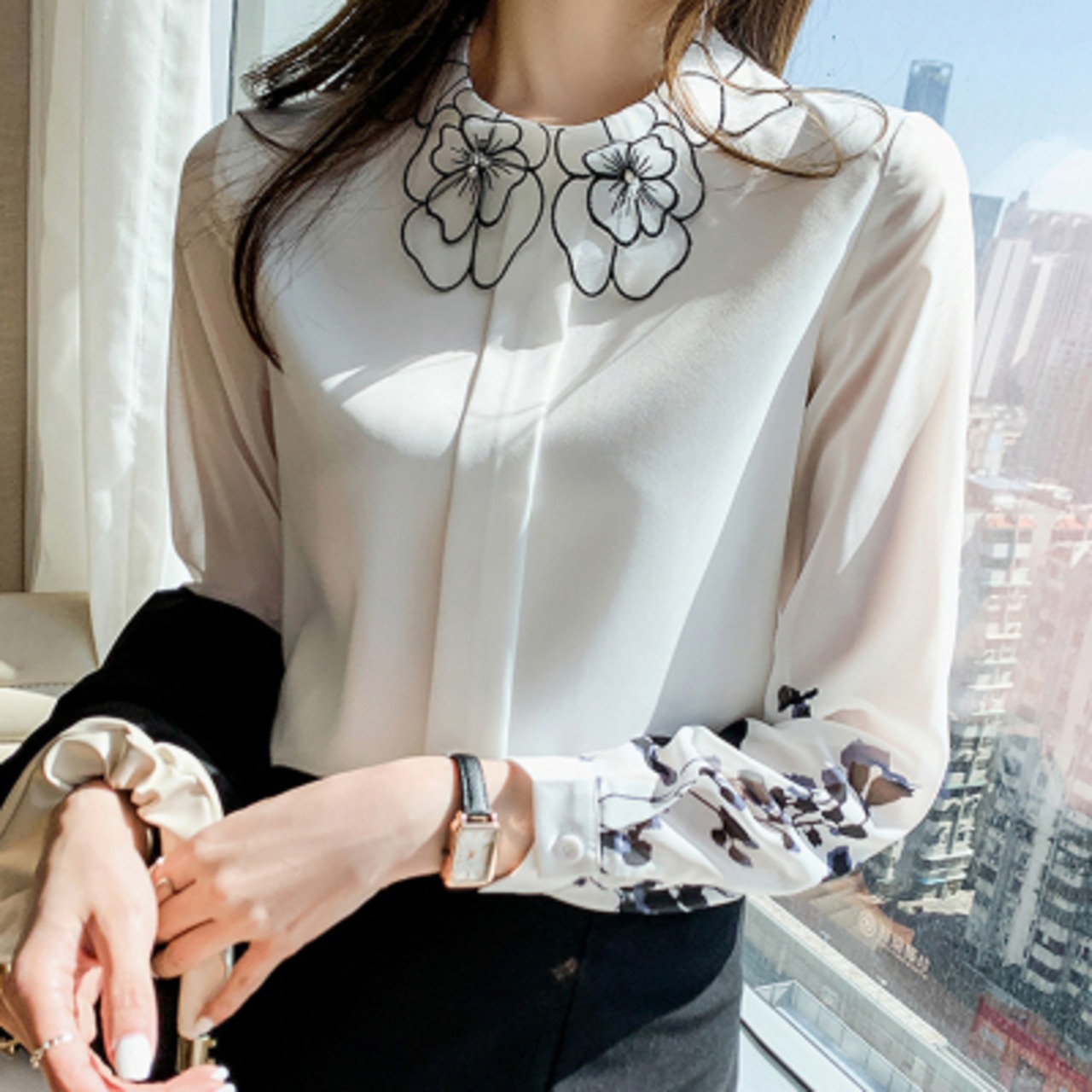 トップス ブラウス シフォン 花柄 長袖 レディース きれいめ 上品 エレガント ゴージャス 比翼仕立て 高級感 スカラップ S М L XL 2XL 大きいサイズ プリント ホワイト 白 黒 ブラック モノクロ フォーマル 20代 30代 40代 50代 60代 着回し シンプル カジュアル ОL オフィス 通勤 仕事 普段着 普段使い 着痩せ 細見え Iライン ストレート 冠婚葬祭 入園 入学式 卒業式 卒園式 オールシーズン 春 夏 秋 冬 柔らか 着心地 華やか 個性的 かわいい 大人可愛い