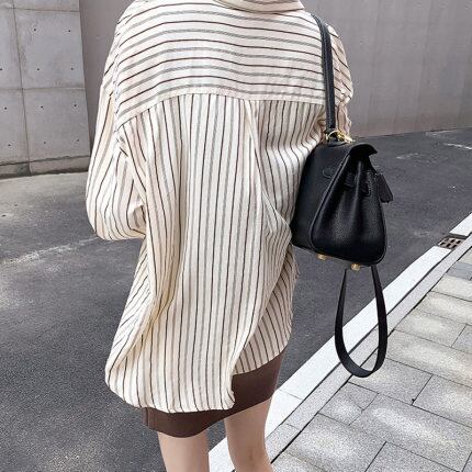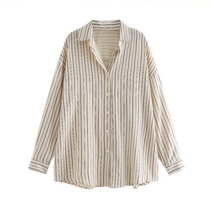 トップス ブラウス ストライプ 長袖 レディース きれいめ 上品 エレガントゆったり 大きめ М L XL 2XL 3XL 4XL 大きいサイズ ベージュ グレー 灰色 定番 20代 30代 40代 50代 60代 着回し シンプル カジュアル 王道 前開き ボタン ОL オフィス 通勤 仕事 普段着 普段使い 体型カバー 着痩せ 細見え Iライン ストレート 襟付き レトロ オシャレ お洒落 個性的 個性派 映え SNS オールシーズン 春 夏 秋 冬 薄手 ドロップショルダー くすみカラー サイズ展開