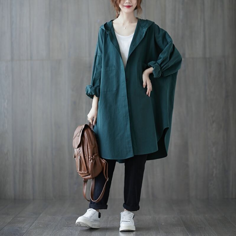 アウター ブラウス 羽織 フード付き オーバーサイズ 長袖 レディース きれいめ 上品 エレガント ゆったり 大きめ 大きいサイズ 無地 グレー 緑 グリーン 黒 ブラック 20代 30代 40代 50代 60代 着回し シンプル カジュアル 前開き ボタン 普段着 普段使い 体型カバー 着痩せ 細見え Iライン ストレート 襟付き レトロ オシャレ お洒落 個性的 個性派 映え SNS 春 秋 冬 薄手 ドロップショルダー ラフ ゆる クール ボーイッシュ お出かけ 買い物 休日 膝上 コート スリット