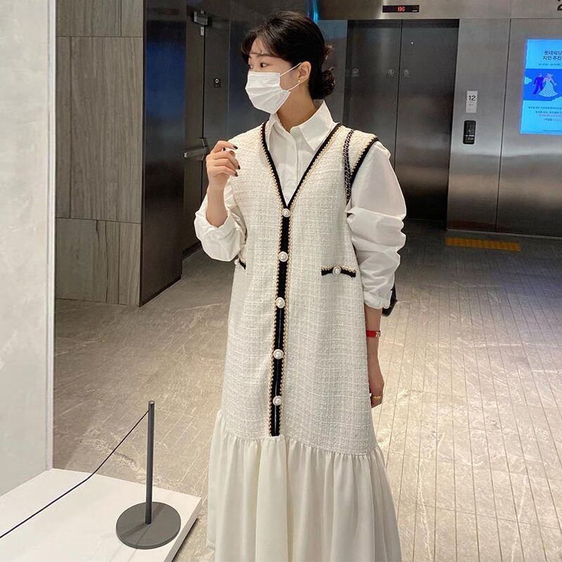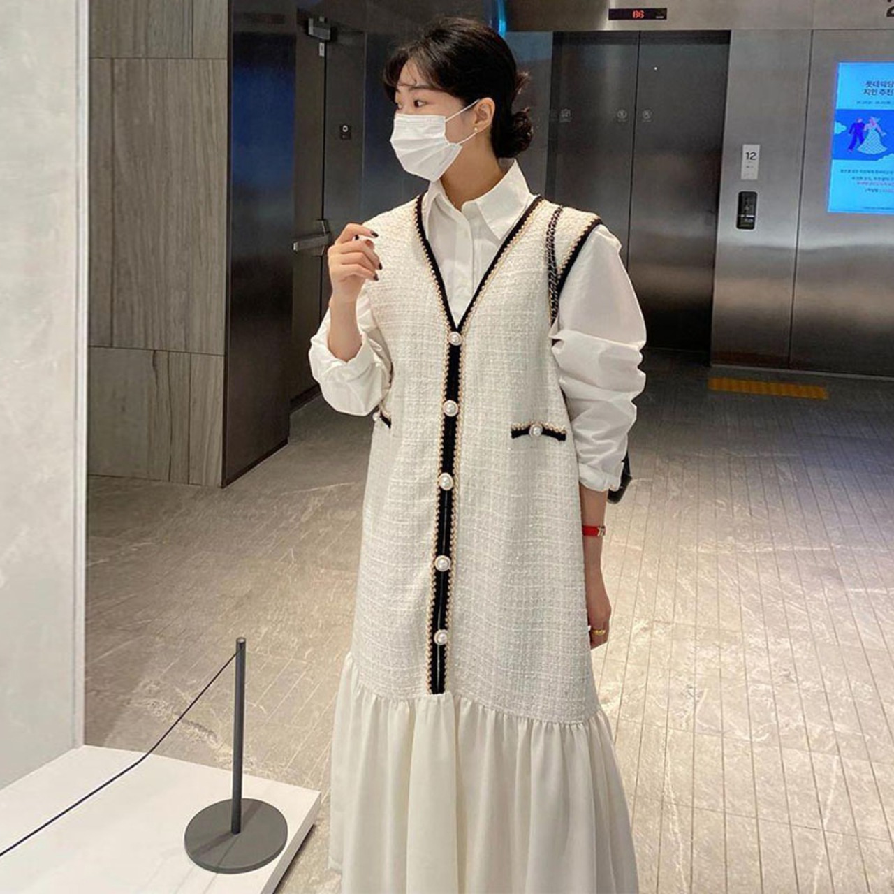 セットアップ レディース ジャンパースカート ジャンスカ ロングワンピース ツイードワンピース 長袖白シャツ Vネック 裾フレア パールボタン 切り替えデザイン ドッキング 2点セット かわいい 大人可愛い きれいめ 大人 上品 おしゃれ お洒落 大人女子 ラブリー 個性的 存在感 ワンサイズ フリーサイズ 黒 ブラック 白 ホワイト 春 秋 冬 10代 20代 30代 40代 通勤 学生 通学 デート お出かけ 女子会 休日 旅行 モテ プレゼント ギフト 着回し 普段使い 重ね着 お揃い 双子