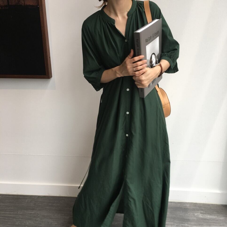 ワンピース シャツワンピース ロング丈 マキシ丈 5分袖 五分袖 バンドカラー スタンドカラー セミフレア ワイド Aライン ウエストマーク ウエストリボン 前開き 綿 大人可愛い シンプル カジュアル おしゃれ こなれ感 ラフ 抜け感 無地 春 夏 秋 10代 20代 30代 40代 50代 60代 レディース 女性用 デート お出かけ 女子会 休日 リゾート 旅行 ホテル レストラン 着回し 普段使い 重ね着 韓国系 オルチャン ファッション 体系カバー 定番 S M L XL グリーン オレンジ