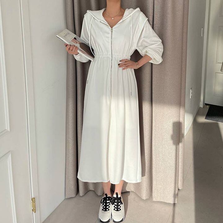 ワンピース レディース ロングワンピース フーディ フード付き セミフレア 袖あり 長袖 ファスナー ウエストゴム ウエストマーク 大人可愛い シンプル カジュアル おしゃれ お洒落 かっこいい 大人女子 こなれ感 ラフ 個性的 抜け感 ワンサイズ フリーサイズ アイボリー 黒 ブラック グレー 灰色 無地 春 秋 10代 20代 30代 40代 50代 60代 ママ 学生 通学 お泊り 部屋着 ルームウエア 休日 アウトドア イベント 体型カバー 普段使い お揃い 双子 韓国 オルチャン 楽ちん
