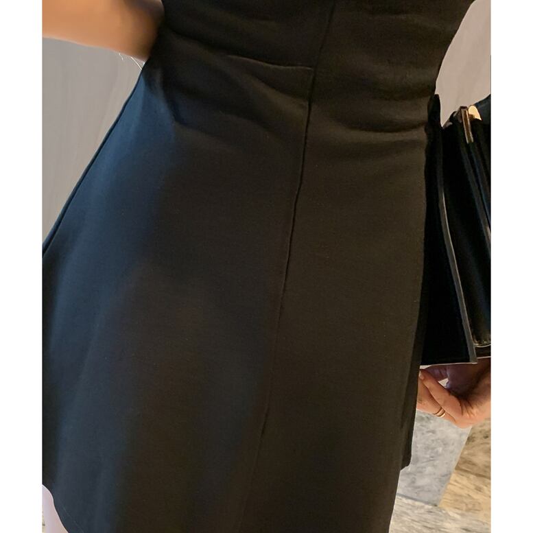 タイトなスリットワンピースとショートパンツのレイヤードスタイルが洗練された女性らしさを演出します