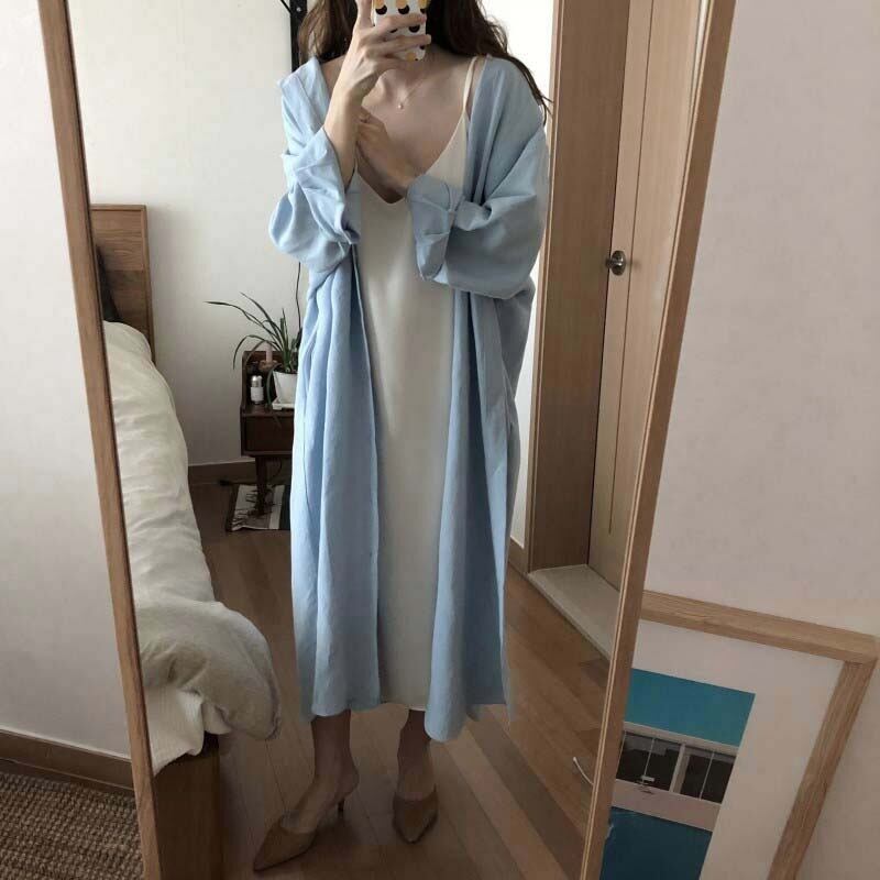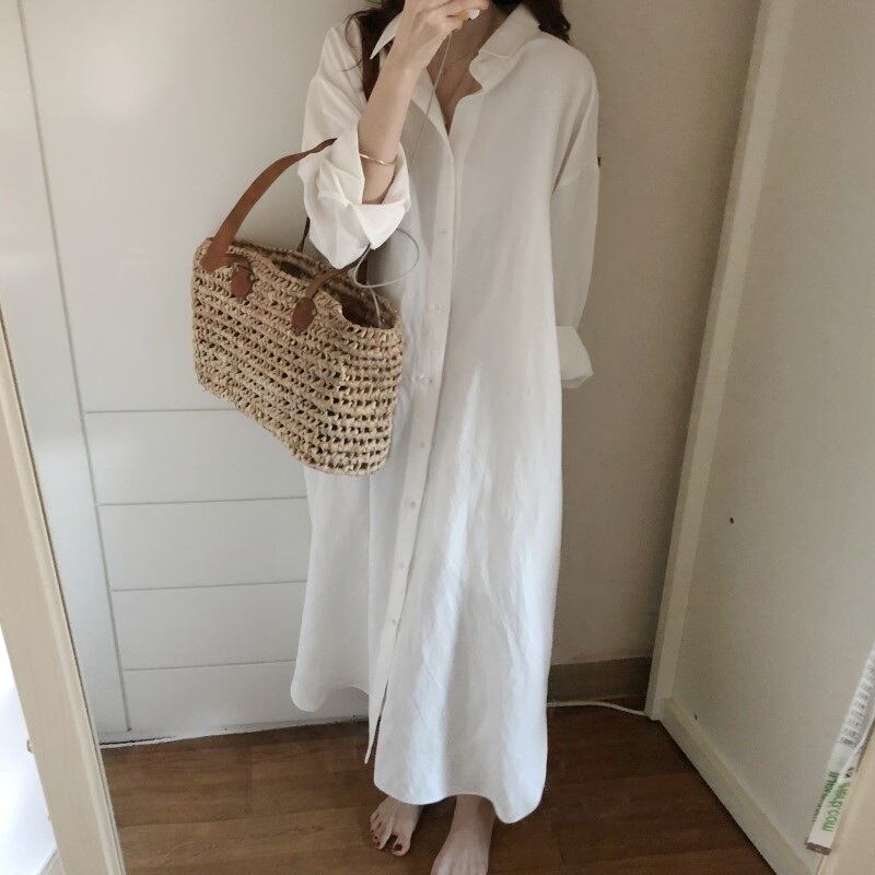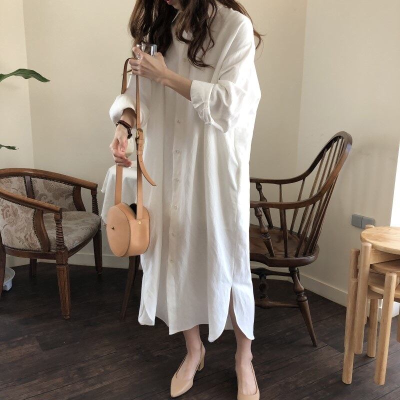 ワンピース 白シャツ シャツワンピース ロング ロング丈 長袖 ドロップショルダー 襟付き セミフレア ワイド 前開き 綿 大人可愛い シンプル カジュアル おしゃれ かっこいい 大人女子 こなれ感 ラフ ルーズ 主役級 存在感 抜け感 無地 春 秋 10代 20代 30代 40代 50代 60代 レディース 女性用 デート お出かけ 公園デビュー 女子会 休日 旅行 着回し 普段使い 重ね着 韓国系 オルチャン ファッション コーデ スタイル 体系カバー 定番 S M L XL ホワイト ライトブルー