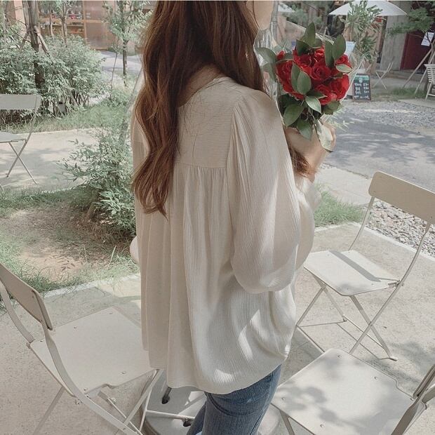シンプルで着回しの効く、フェミニンな雰囲気のトップスです。
