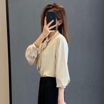 トップス ブラウス リボン タイ付 長袖 ゆったり レディース きれいめ 上品 エレガント 大きめ S М L ベージュ アプリコット ブルー 水色 くすみカラー お洒落 オシャレ かわいい 大人可愛い レトロ フェミニン 20代 30代 40代 50代 ОL 通勤 仕事 オフィス シンプル カジュアル 着心地 春 秋 冬 こなれ感 休日 お出かけ 買い物 公園 仕事 オフィスふんわり 柔らか 無地 とろみ 女子会 デート 韓国 トレンド 流行 前開き ボタン ボリューム 袖 高級感