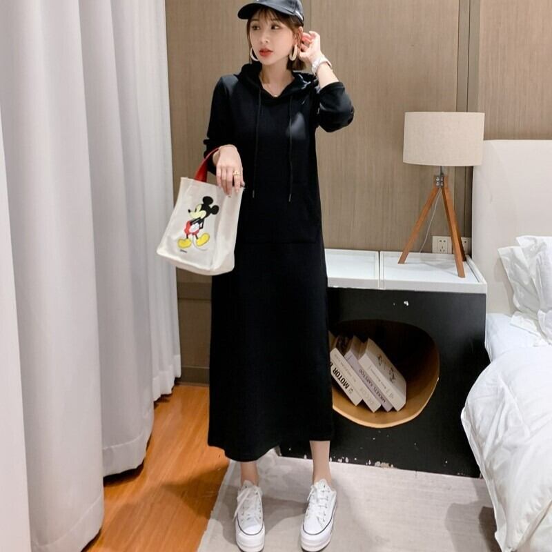 ワンピース プルオーバー パーカー フーディー 膝下 ミモレ ミモレ丈 ロング 袖あり 長袖 ラウンドネック 襟なし ストレート Iライン フード付き ポケット シンプル カジュアル おしゃれ お洒落 かっこいい 大人女子 こなれ感 ラフ メンズライク マニッシュ ボーイッシュ スポーティー 個性的 クール 無地 レディース 女性用 ママ マタニティ お出かけ 公園デビュー 休日 着回し 普段使い 韓国 楽ちん 体系カバー M L XL 2XL 3XL 大きいサイズ ゆったり ゆる 黒 ブラック