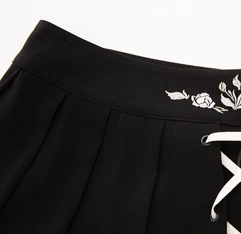 スカート ミニスカート 編み上げ 刺繍 プリーツ ハイウエスト レディース ショート丈 リボン かわいい 大人可愛い ガーリー 学生 スクール 量産型 学校 制服 地雷系 トレンド 韓国 流行 オシャレ お洒落 個性派 個性的 シック 姫系 パンク ロック クール 10代 20代 30代 Aライン オールシーズン 春 夏 秋 冬 美脚 脚長 フラワー 花 黒 ブラック 白 ホワイト モノクロ 着回し カジュアル 普段使い 普段着 ショッピング S М L XL 女子会 デート 映え SNS インスタ