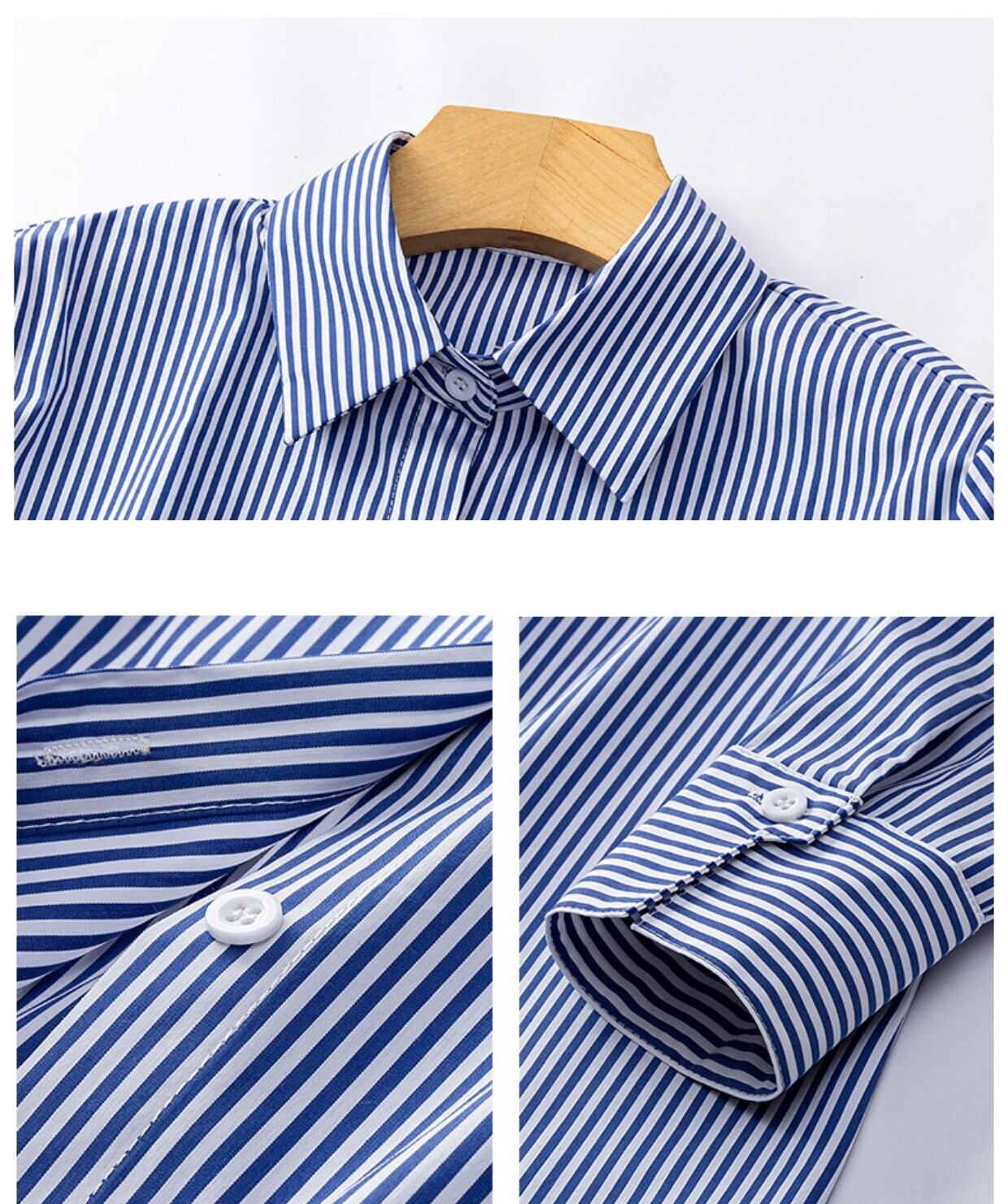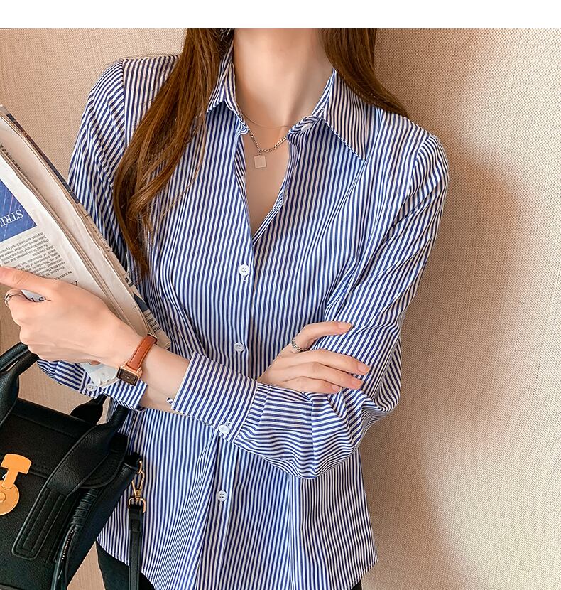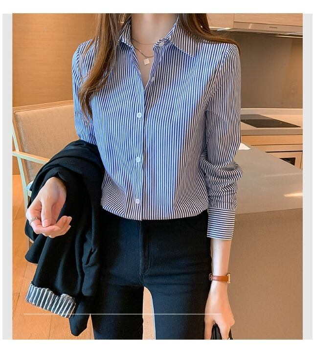 シャツ レディース トップス ブラウス S M L XL 2XL 3XL ブルー 青 ストライプ 大人カラー 春 秋 長袖 襟付き フロントボタン ショート丈 ミドル丈 ストレート スリム 細身 ママ フェミニン ナチュラル カジュアル きれいめ きれカジ 大人 大人可愛い こなれ感 ぬけ感 存在感 主役級 休日 お出かけ お呼ばれ クール スタイリッシュ かっこいい 定番 万能 着回し 王道 シンプル ベーシック 通学 学生 韓国 オルチャン さわやか 清潔感 きちんと感 OL オフィス 通勤 上品