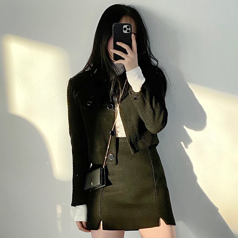 セットアップ レディース ノーカラージャケット ミニスカート Aライン 袖あり 長袖 ポケット ボタン ラウンドネック 襟なし ノーカラー スリット ツイード 上下セット 2点セット ツーピース かわいい 大人可愛い きれいめ 大人 上品 おしゃれ お洒落 レトロ 大人女子 ガーリー クール エレガント S M 黒 ブラック 無地 春 秋 謝恩会 結婚式 二次会 披露宴 10代 20代 30代 デート お出かけ 女子会 パーティー イベント 旅行 モテ 美脚 脚長 プレゼント ギフト 定番 韓国