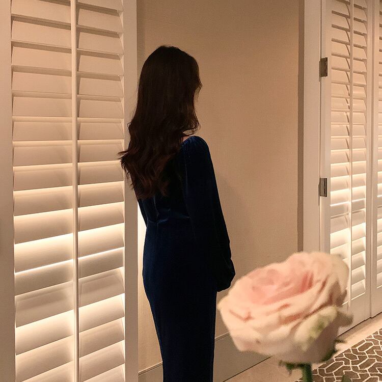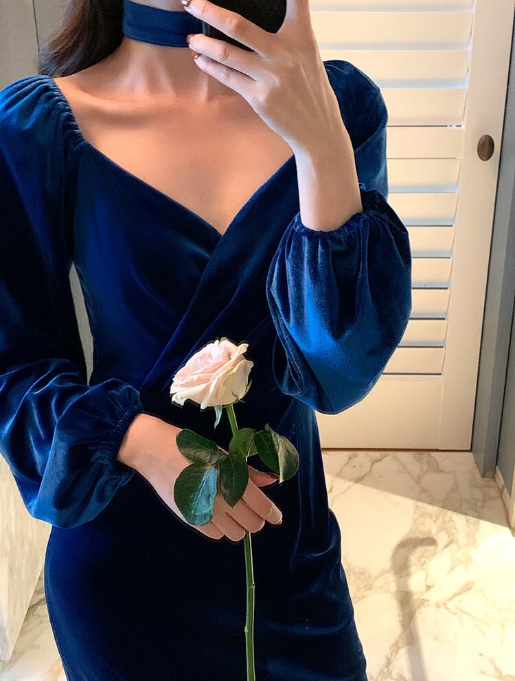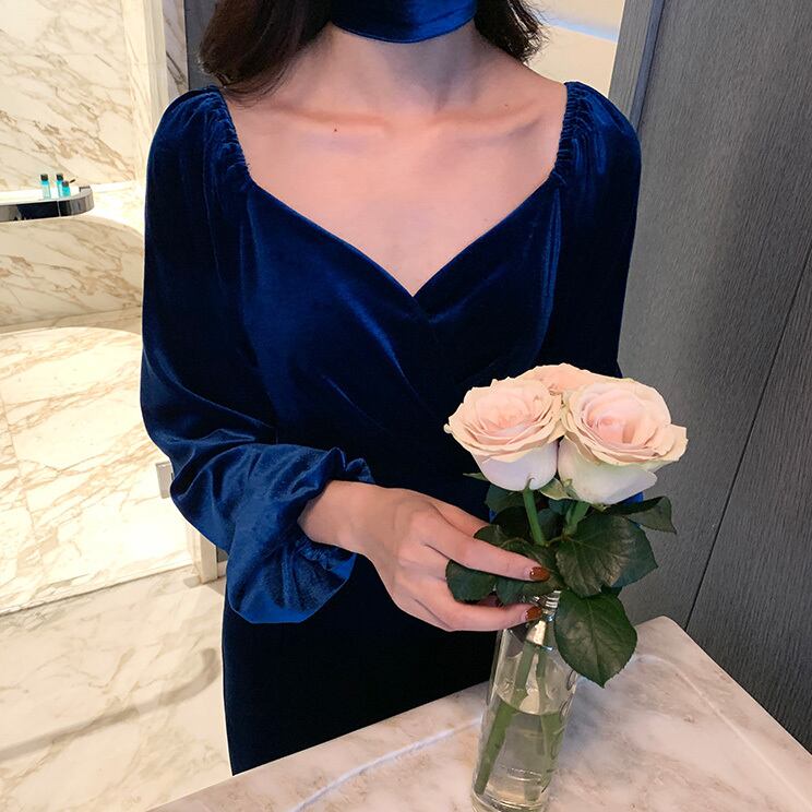 冬 ベルベット ドレス パーティドレス ミモレ丈ドレス フォーマルドレス ワンピドレス ミディアム丈 袖あり 長袖 ランタンスリーブ Vネック 襟なし 細身 タイプA プリーツ ハイウエスト レギュラー 異素材MIX 大人可愛い きれいめ 大人 上品 おしゃれ 大人女子 ガーリー 個性的 モード系 エレガント フォーマル クラシック お嬢様 無地 20代 30代 レディース 女性用 ママ OL デート 休日 リゾート レストラン ファッション 美脚 インスタ映え 冬 パーティー ワンサイズ レトロブルー