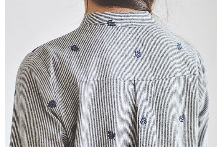 トップス ブラウス シャツ ストライプ 刺繍 リーフ 長袖 ゆったり レディース きれいめ 上品 大きめ S М L XL 2XL グレー 灰色 ネイビー お洒落 オシャレ かわいい 大人可愛い 20代 30代 40代 50代 ОL 通勤 仕事 オフィス シンプル カジュアル 春 秋 こなれ感 休日 お出かけ 買い物 公園 女子会 韓国 トレンド 流行 高級感 Iライン ストレート 前開き ポケット クール 新作 2022 総柄 クール 知的 襟なし