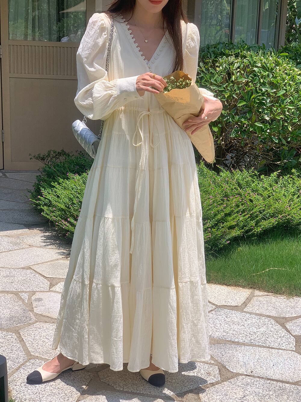 アイボリーカラーVネックロングワンピース。