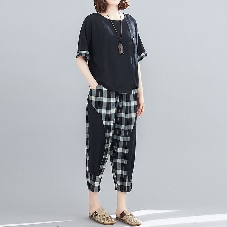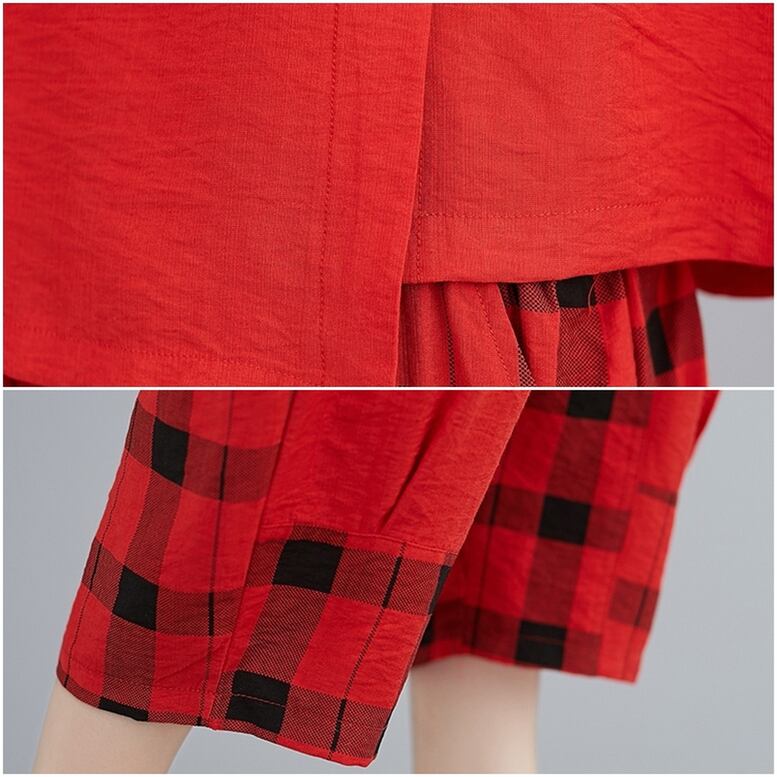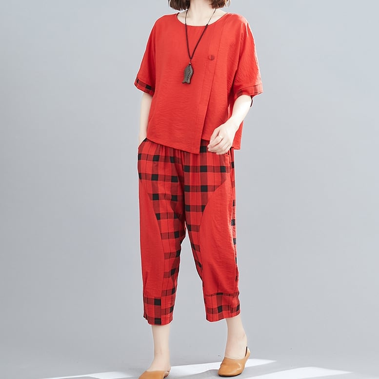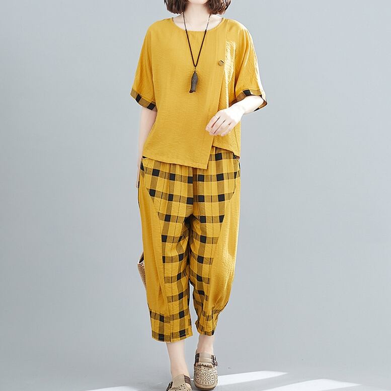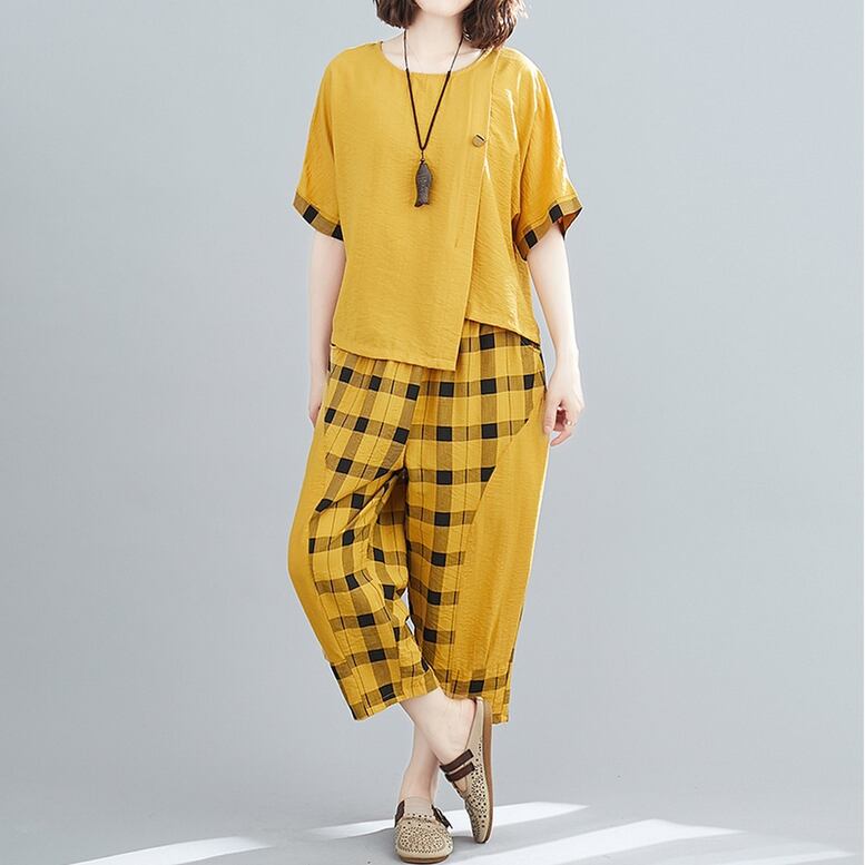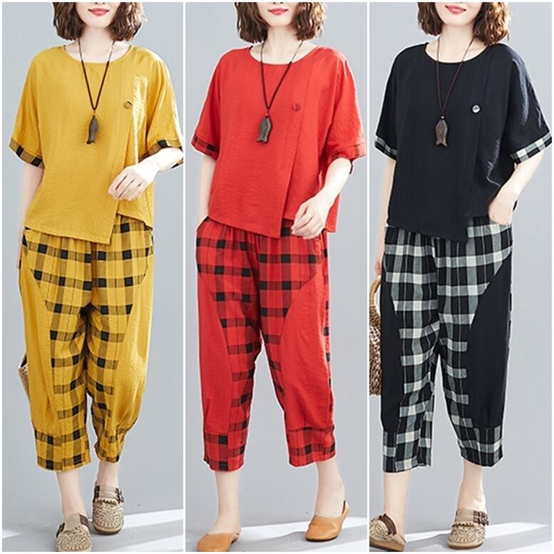 チェック柄MIXパンツリラックスセット セットアップ レディース ツーピース 2点セット 上下セット チェック柄 配色 切り替え アシンメトリー ラウンドネック 半袖 Tシャツ トップス コクーンパンツ イージーパンツ 黄色 黒 赤 イエロー ブラック レッド 大人可愛い きれいめ 上品 エレガント フォーマル ガーリー マニッシュ ルーズ キュート 春 夏 秋 冬 二次会 通勤 通学 デート お出かけ パーティー イベント 休日 体型カバー 普段使い 定番 トレンド ゆったり インスタ映え