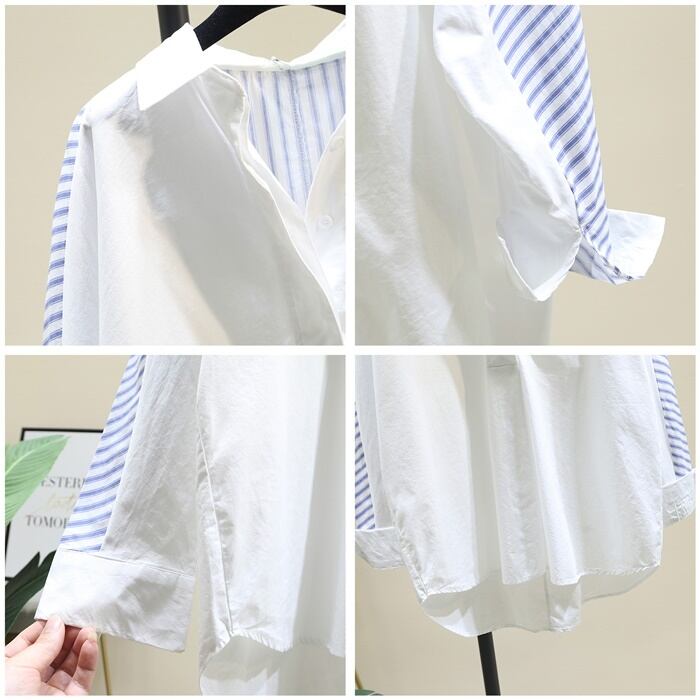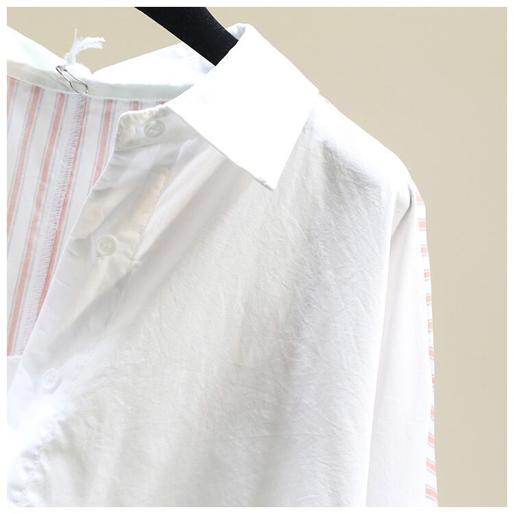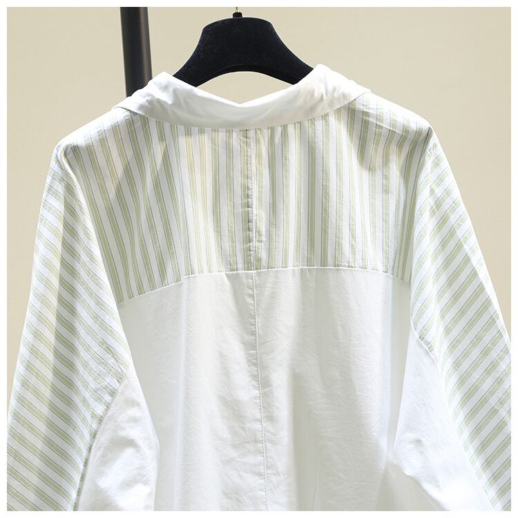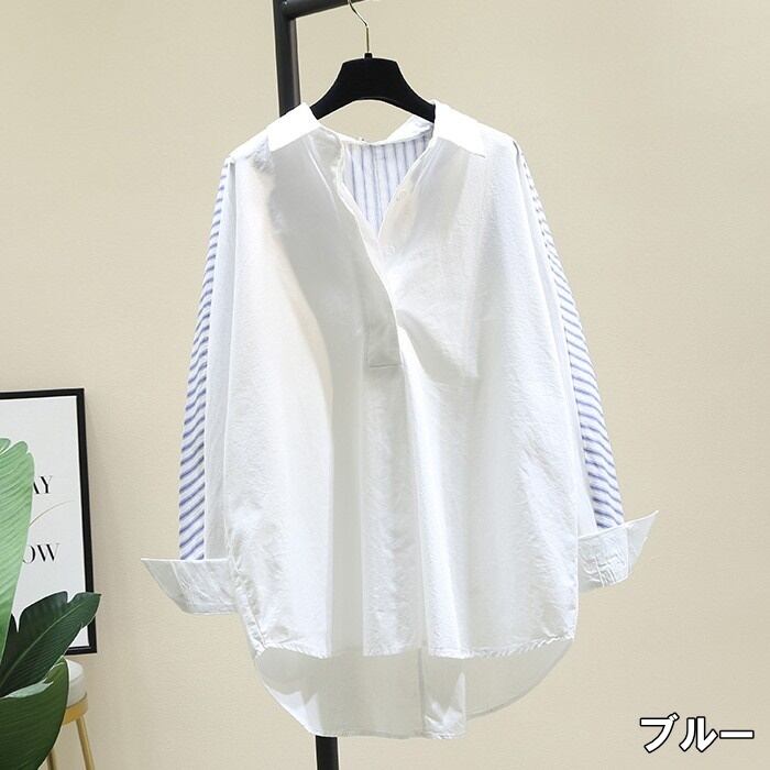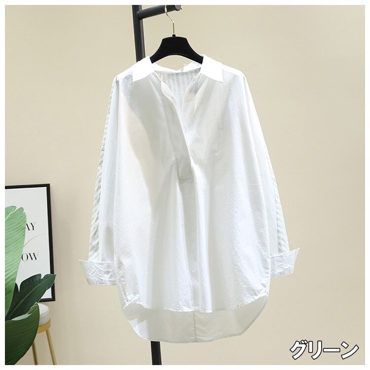 シャツ レディース トップス ブラウス ワンサイズ フリーサイズ ブルー 青 グリーン 緑 ピンク ホワイト 白 ストライプ 切り替え ドッキング バックシャン 大人カラー パステルカラー 春 秋 長袖 襟付き ボタン ロング丈 ミドル丈 ストレート ルーズ ゆったり ゆる ママ フェミニン ナチュラル カジュアル きれいめ きれカジ 大人 大人可愛い こなれ感 ぬけ感 存在感 主役級 休日 お出かけ 定番 万能 着回し 王道 シンプル ベーシック 通学 学生 韓国 オルチャン さわやか 清潔感 上品