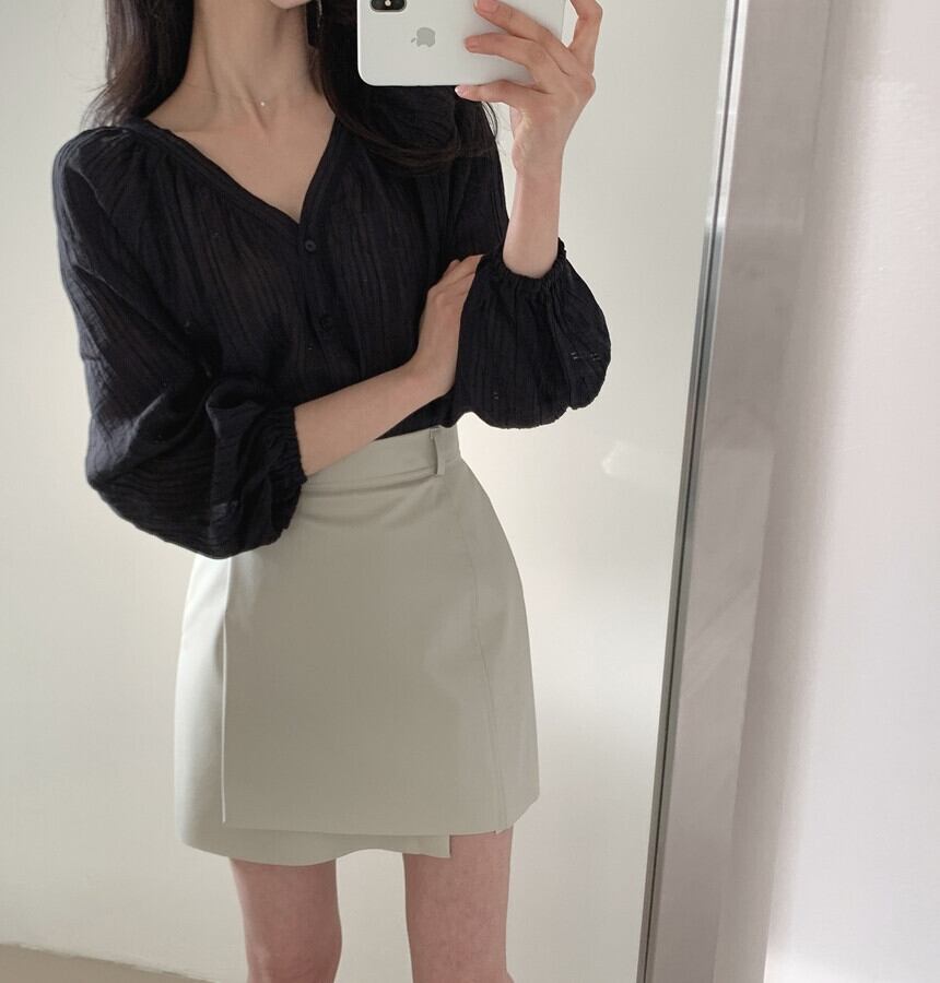 凸凹生地と胸元、袖口のシャーリングデザインが大人のこなれ感を演出◎