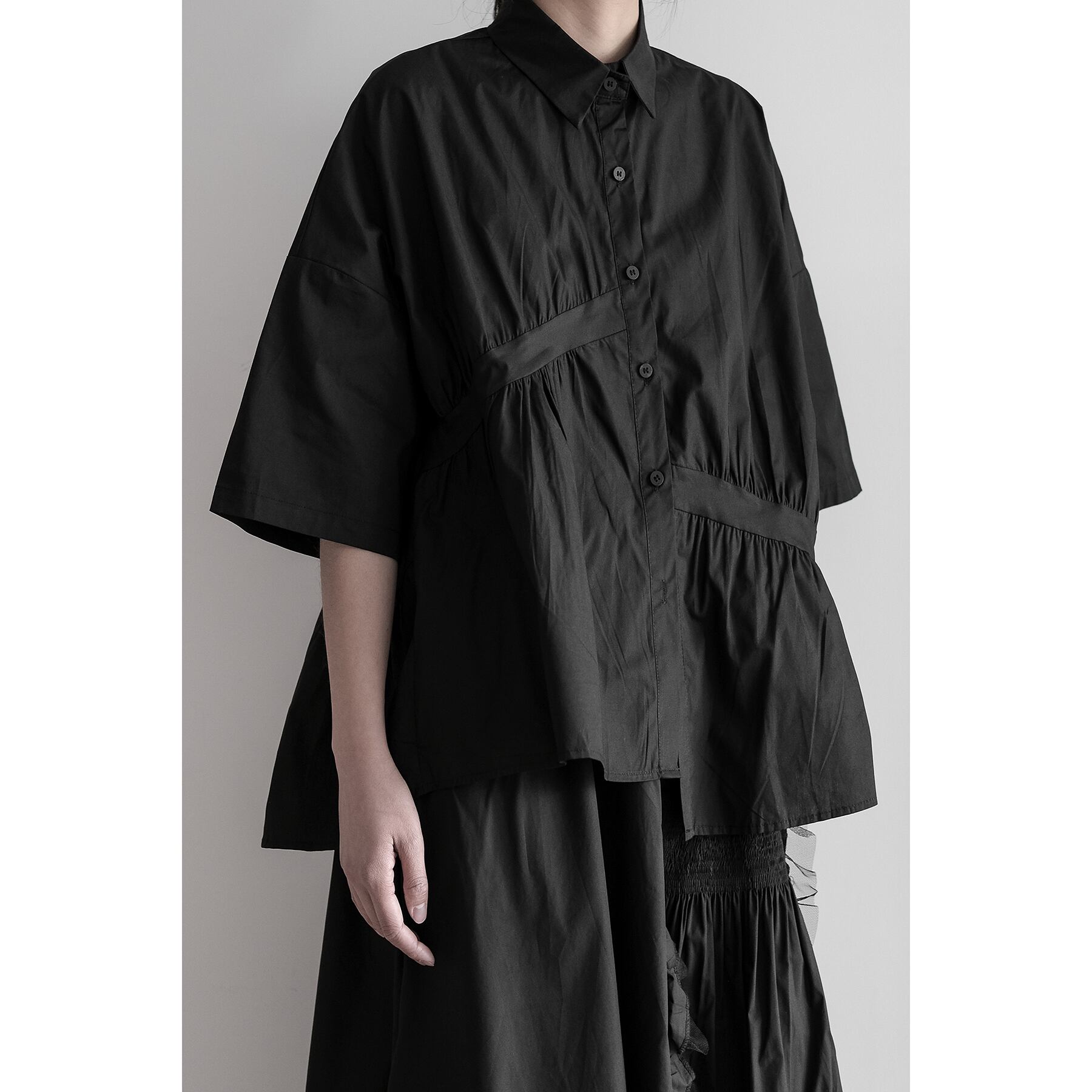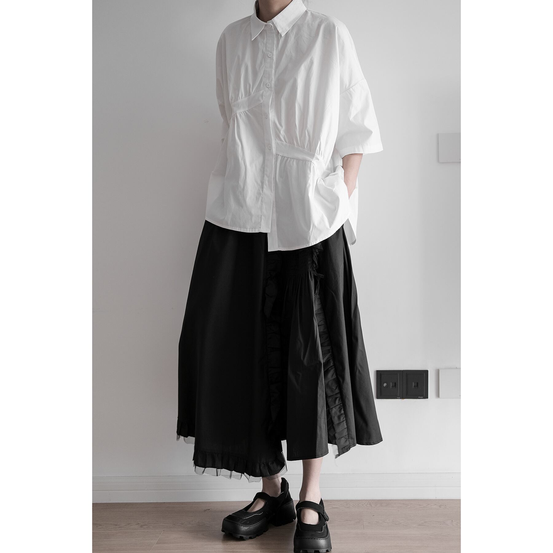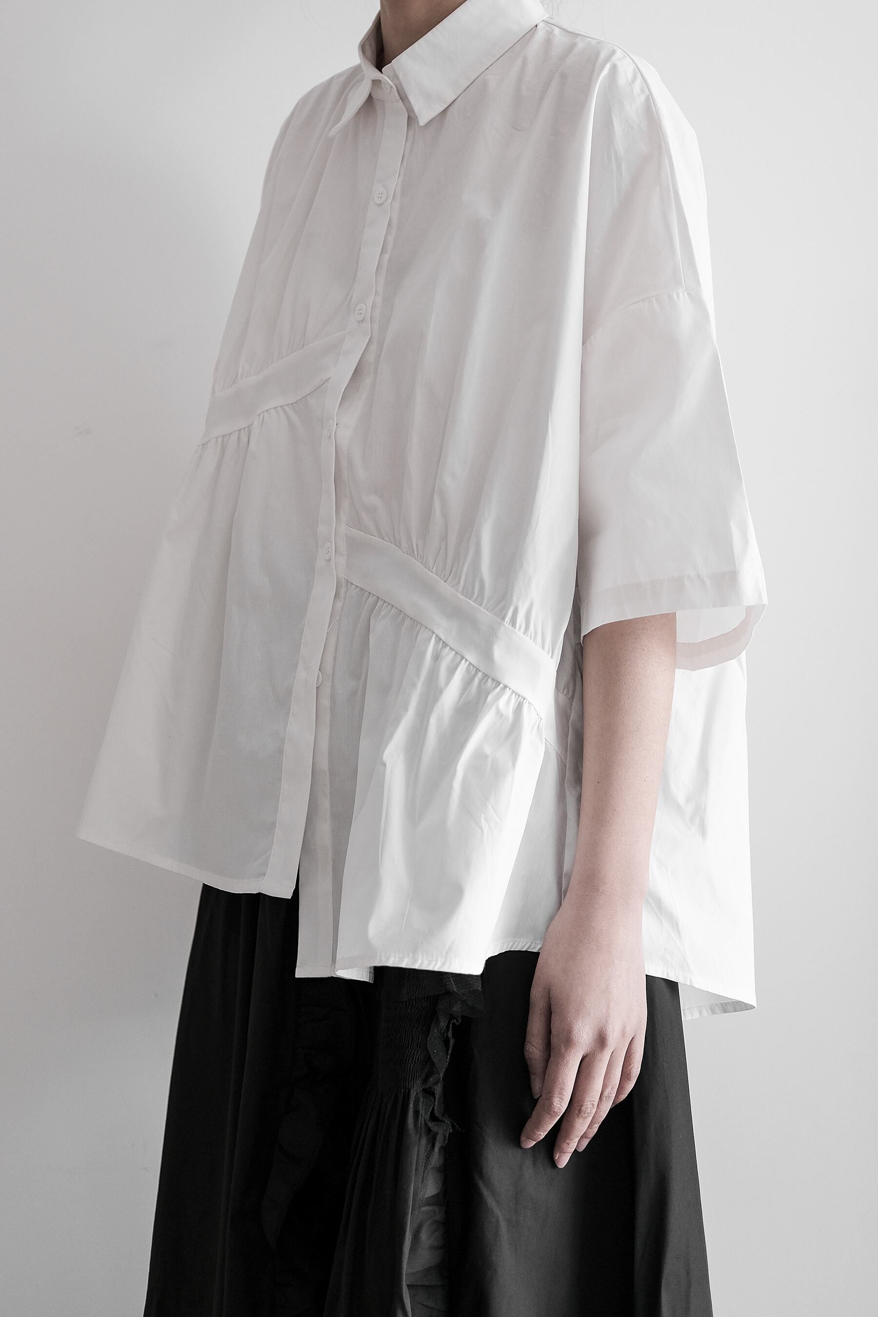 トップス レディース シャツ 白シャツ ボタン 前開き フレア アシンメトリー 袖あり 5分袖 五分袖 襟付き シャーリング ルーズ ドッキング きれいめ シンプル おしゃれ お洒落 かっこいい こなれ感 ラフ メンズライク マニッシュ ボーイッシュ 個性的 クール モード モダン 存在感 爽やか 抜け感 ワンサイズ フリーサイズ 白 ホワイト 黒 ブラック 無地 春 秋 夏 10代 20代 30代 40代 50代 体型カバー 男女兼用 ママ 学生 通学 お出かけ 女子会 休日 パーティー プレゼント