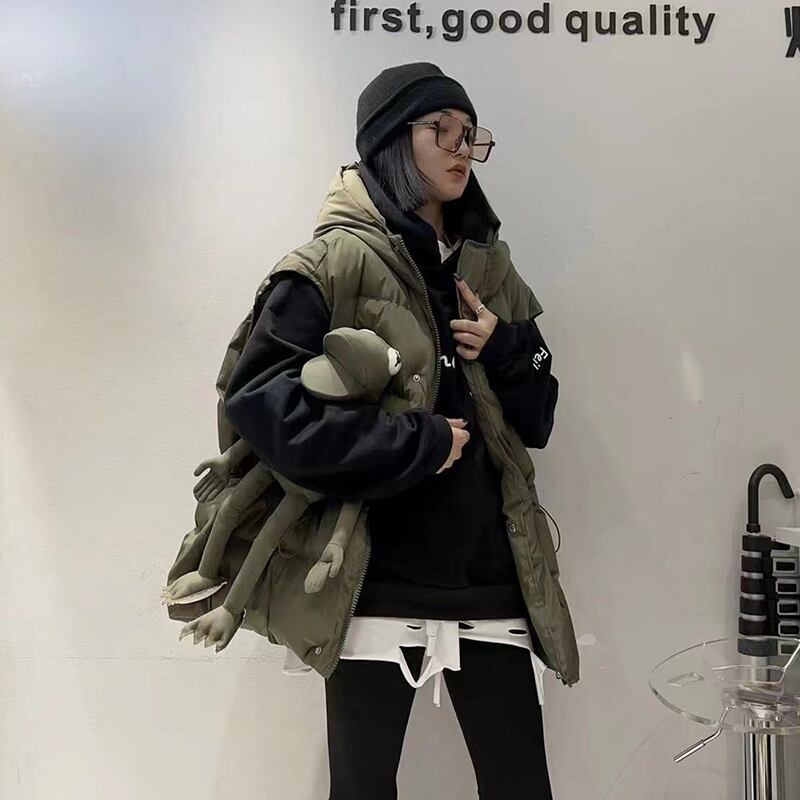 ベスト レディース トップス ダウンベスト ワンサイズ フリーサイズ ブラック 黒 グリーン 緑 大人カラー くすみカラー 秋カラー ジップアップ ジップ ジッパー 前開き 袖なし 秋 冬 フード付き レイヤード 重ね着 ミドル丈 ロング丈 ストレート ルーズ ゆったり ゆる ボリューミー 防寒 あったか カジュアル ナチュラル きれいめ きれカジ ストカジ 大人 大人可愛い お出かけ 休日 アウトドア シンプル ベーシック 着回し 定番 万能 存在感 主役級 アクセント 学生 通学 韓国 オルチャン