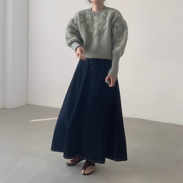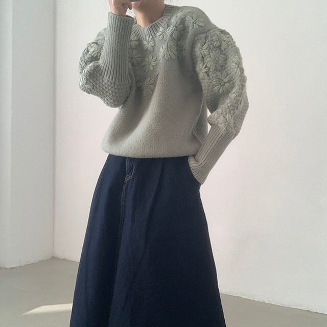 トップス ニット セーター 花 立体 モチーフ 長袖 ラウンドネック レディース 上品 エレガント 高級感 ゆったり 大きめ 20代 30代 40代 50代 60代 着回し シンプル カジュアル 普段着 普段使い オシャレ お洒落 ゆる ルーズ ラフ かわいい 大人可愛い ガーリー 秋 冬 春 休日 お出かけ 買い物 ショッピング シック モード こなれ感 あったか 暖かい くすみカラー ベージュ グレー 灰色 レトロ アンティーク ボリューム 袖 ドロップショルダー