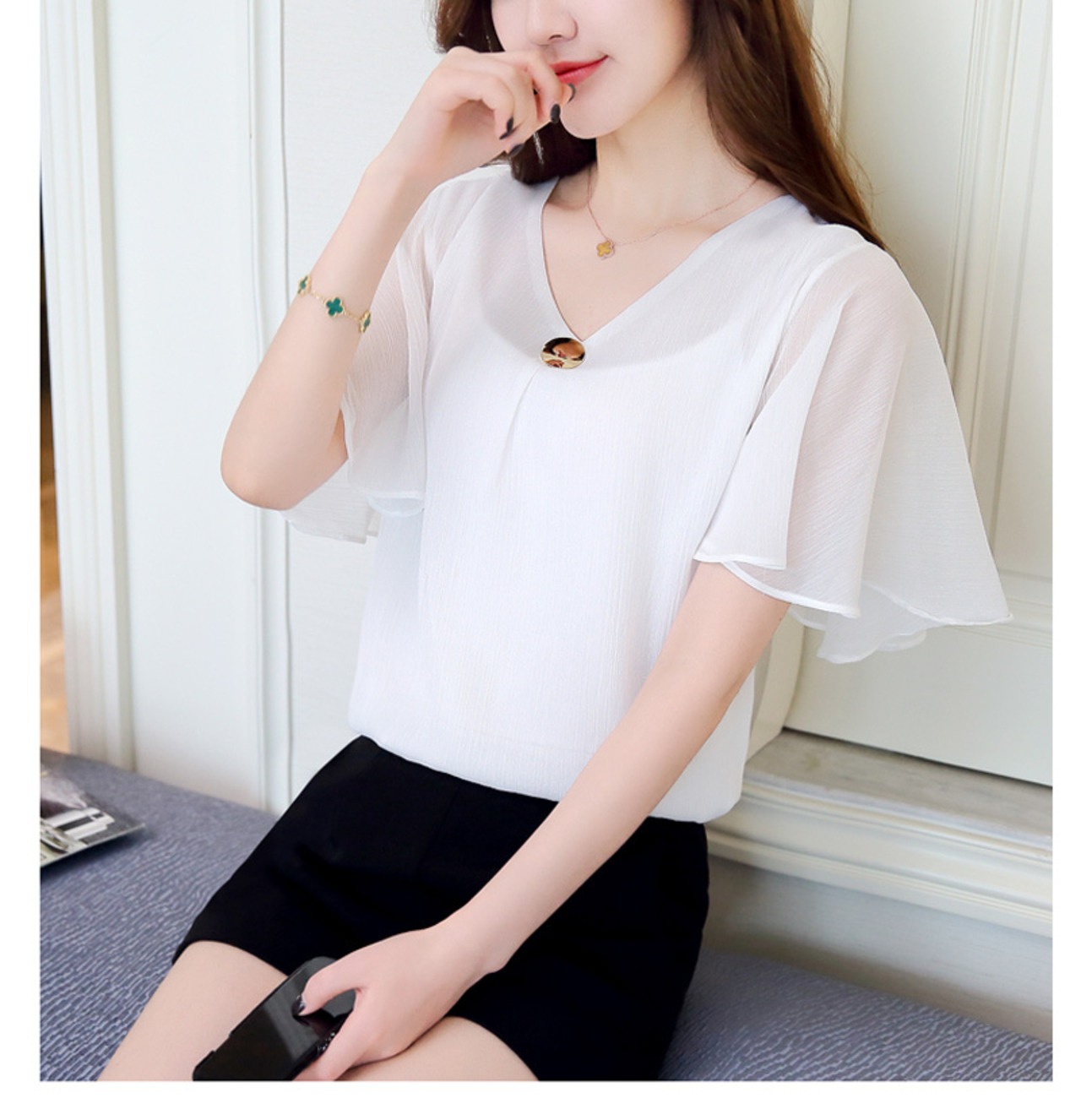 2色カラバリ、半袖シフォンVネックブラウス。
