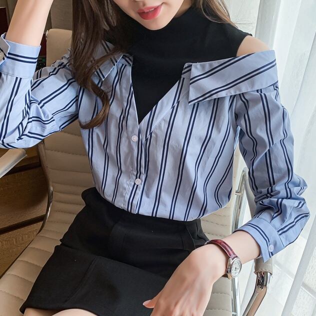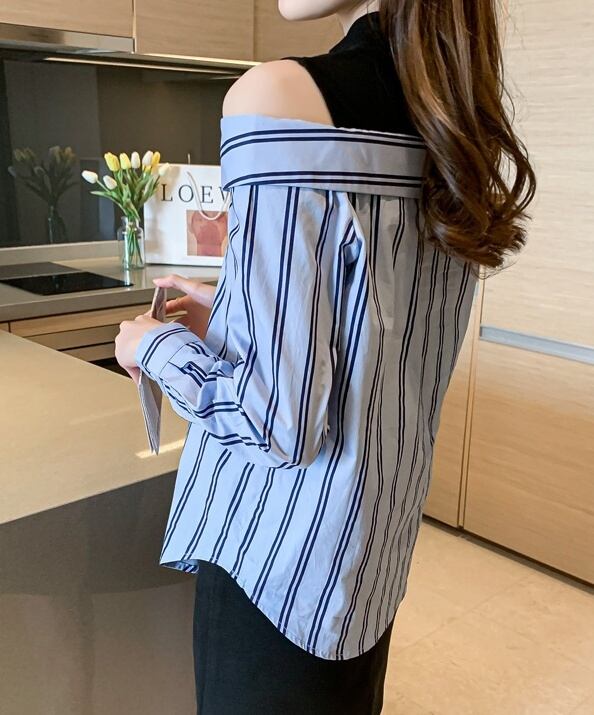 トップス ブラウス シャツ ストライプ 切り替え ドッキング オフショルダー 長袖 レディース きれいめ 上品 大きめ 大きいサイズ S М L XL 2XL お洒落 オシャレ かわいい 大人可愛い 20代 30代 10代 シンプル カジュアル 春 秋 夏 休日 お出かけ 買い物 女子会 韓国 トレンド 流行 Iライン ストレート 体型カバー 着痩せ 薄手 ラフ ブラック 黒 白 ブルー 水色 清潔感 清楚 前開き 襟付き 重ね着 ルーズ こなれ感 セクシー カットソー 肩出し 韓国 流行 トレンド