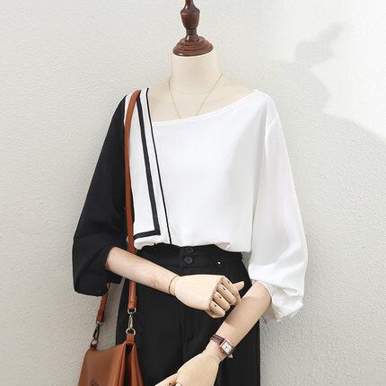トップス ブラウス バイカラー アシンメトリー Vネック シャツ カットソー 長袖 レディース きれいめ 上品 エレガント アート 大きめ 大きいサイズ S М L XL お洒落 オシャレ かわいい 大人可愛い 20代 30代 40代 50代 60代 ОL 通勤 仕事 オフィス シンプル カジュアル 春 秋 夏 冬 オールシーズン 休日 お出かけ 買い物 女子会 韓国 トレンド 流行 Iライン ストレート 着回し 薄手 ラフ ホワイト 白 黒 ブラック 清潔感 清楚 知的 個性的 個性派 シック モード
