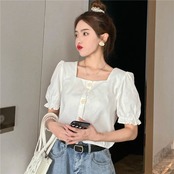 トップス ブラウス カットソー スクエアネック パフスリーブ フリル 半袖 レディース きれいめ 上品 清楚 清潔感 エレガント お洒落 オシャレ フェミニン ガーリー フェアリー かわいい 大人可愛い 20代 30代 40代 50代 60代 ОL 通勤 シンプル カジュアル 春 夏 こなれ感 休日 お出かけ 買い物 女子会 韓国 トレンド 流行 ホワイト イエロー 黄色 無地 デコルテ 鎖骨 華奢 薄手 着回し 重ね着 しわ加工 大きめ 大きいサイズ М L XL 2XL レトロ ショート丈 脚長 美脚