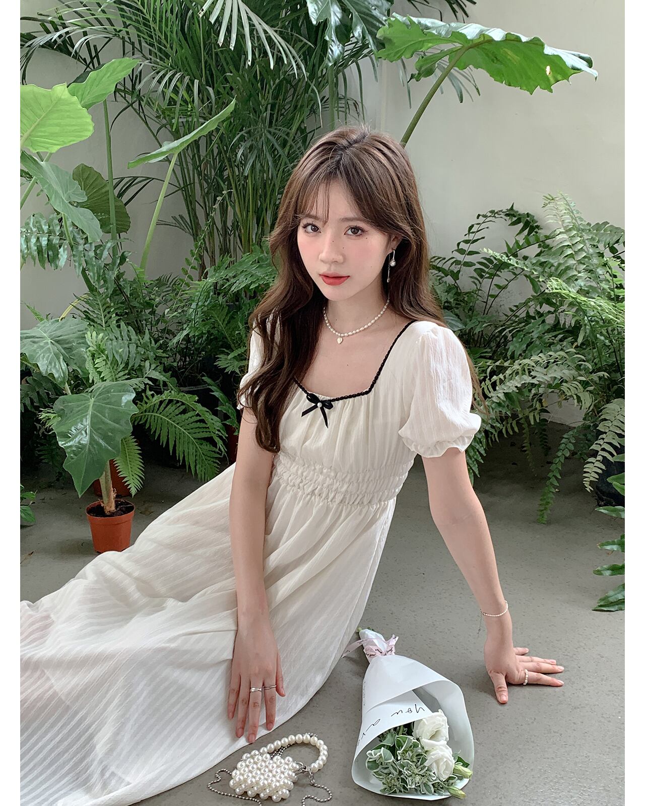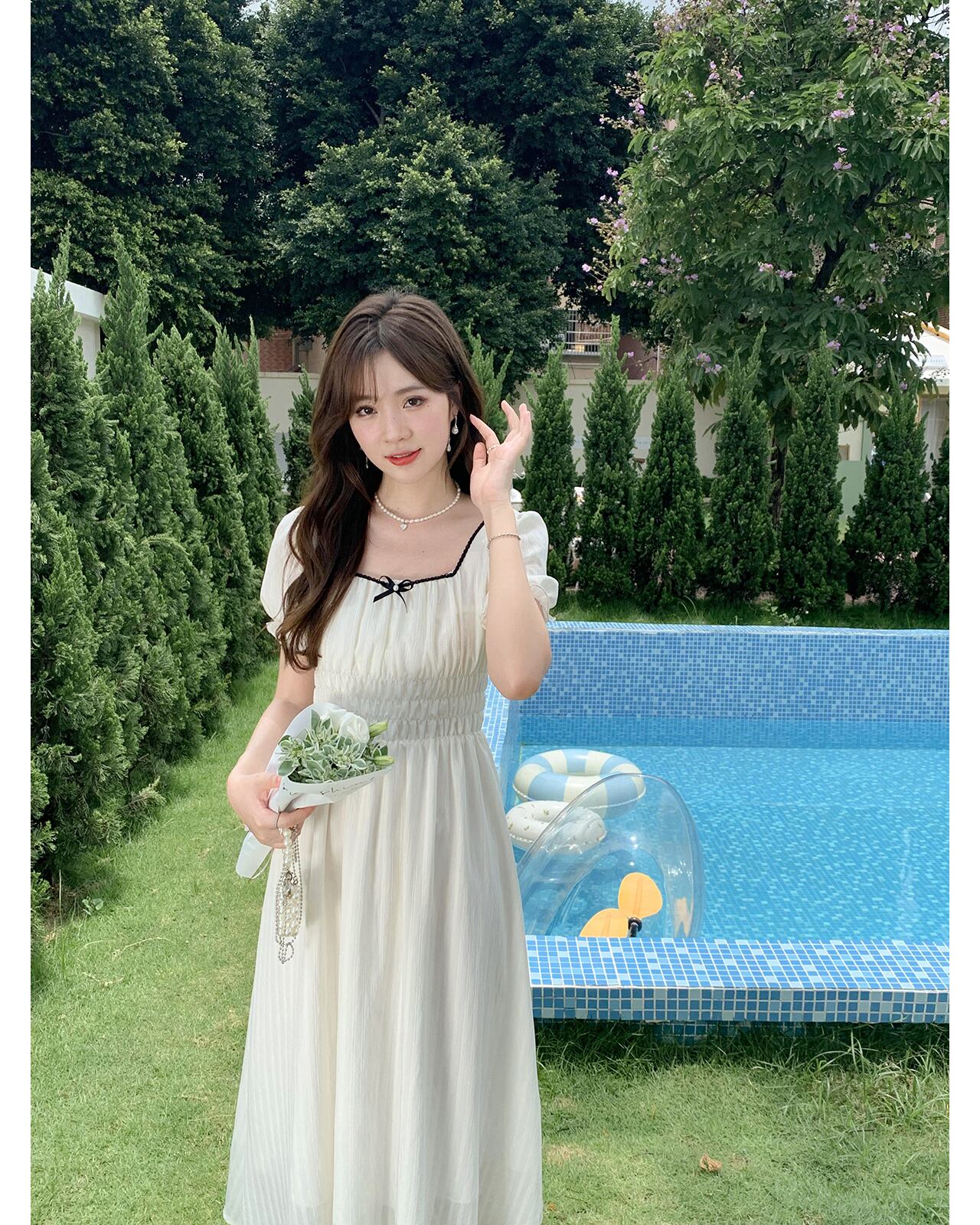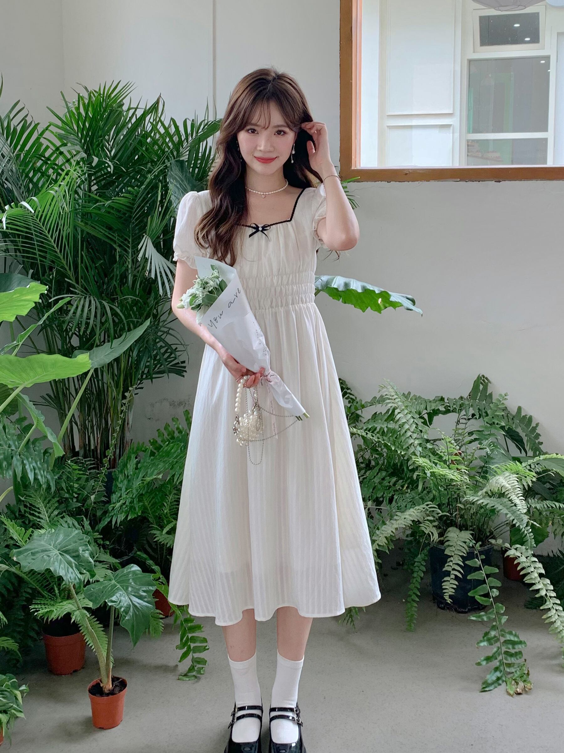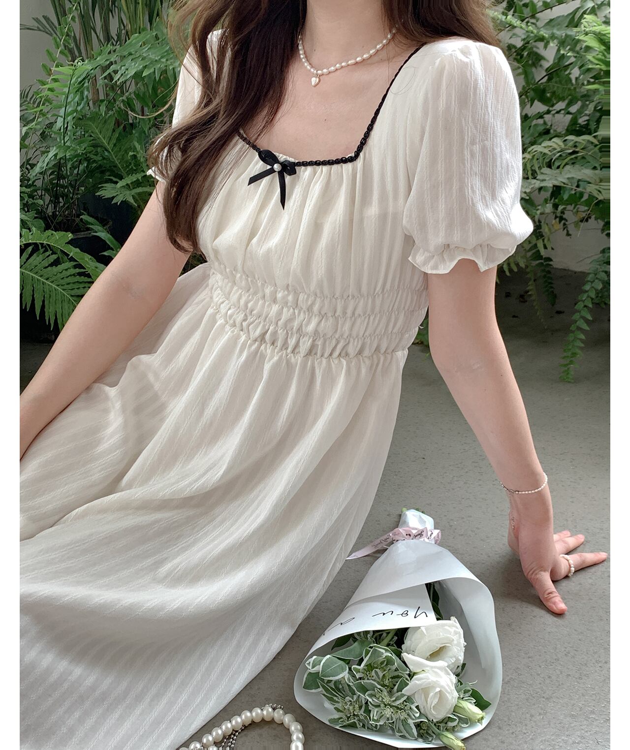 可憐な印象のスクエアネック半袖膝下丈ワンピース。