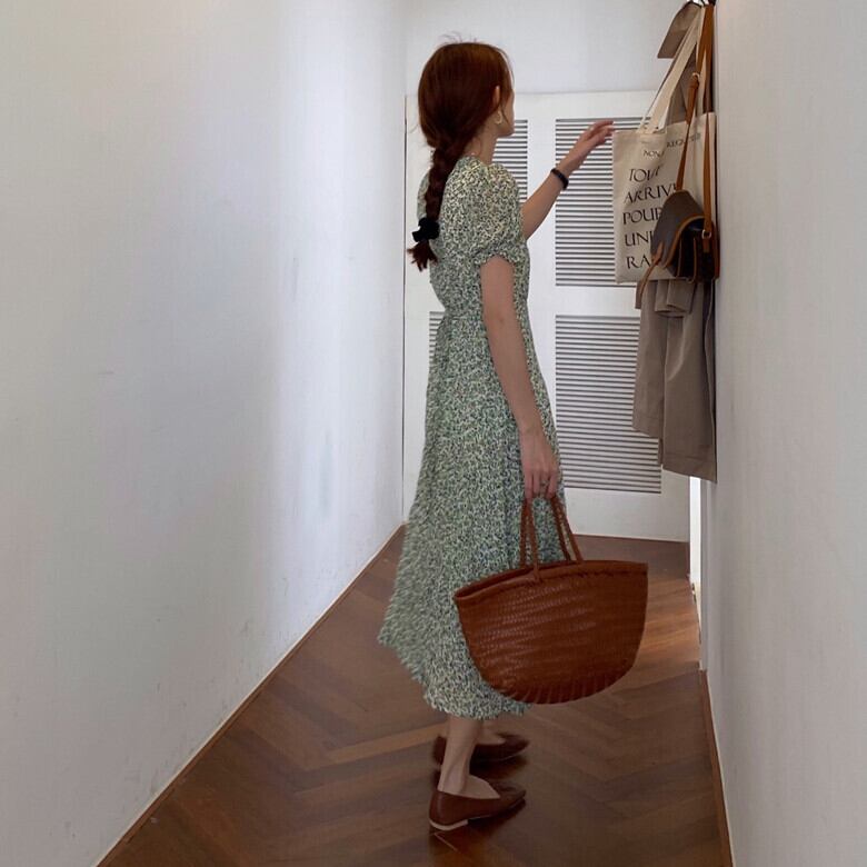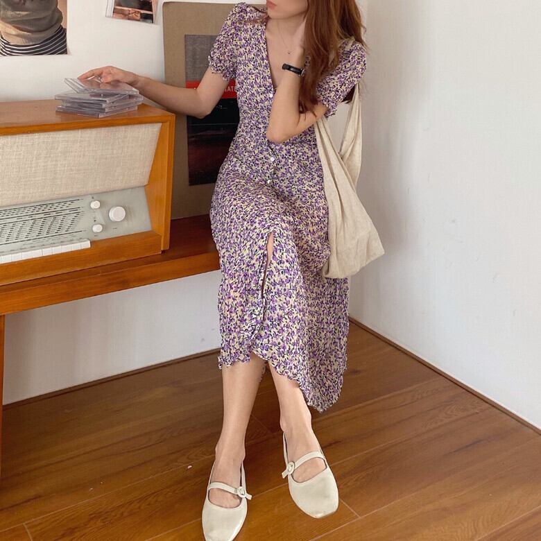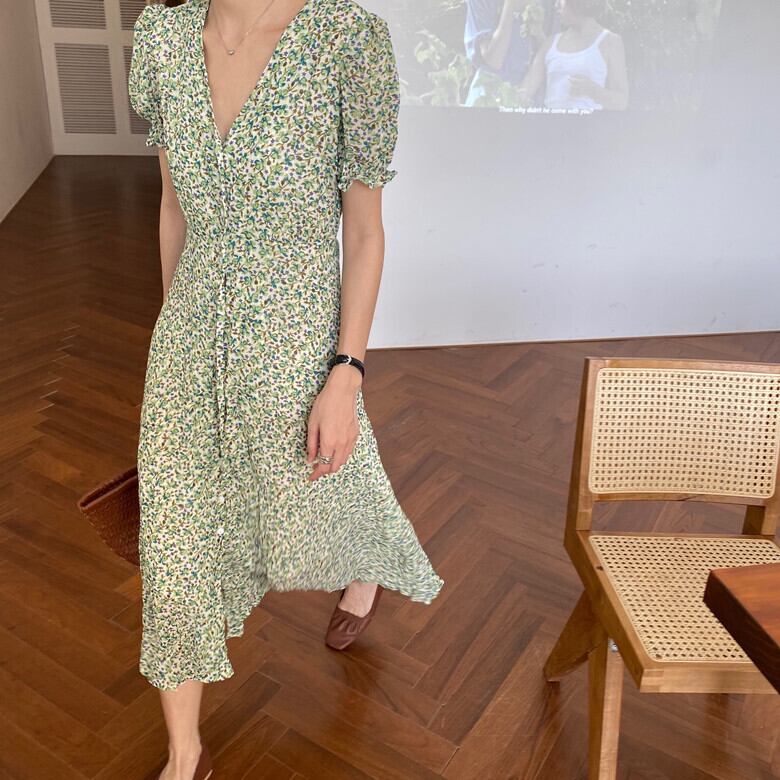 ワンピース レディース フレアワンピース ミモレ丈 袖あり 半袖 パフスリーブ Vネック 前開き ボタン セミフレア Aライン バックリボン かわいい 大人可愛い きれいめ 大人 上品 おしゃれ お洒落 レトロ 大人女子 こなれ感 ラブリー セクシー エレガント 華やか 存在感 とろみ感 抜け感 ワンサイズ フリーサイズ 花柄 小花柄 フラワー グリーン 緑 パープル 紫 夏 20代 30代 40代 50代 ママ デート お出かけ 女子会 休日 パーティー リゾート 海 旅行 プール モテ プレゼント