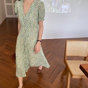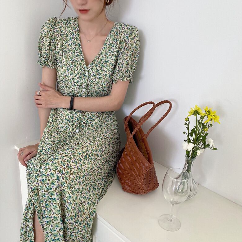 2色カラバリ、Vネックパフスリーブミモレ丈ワンピース。