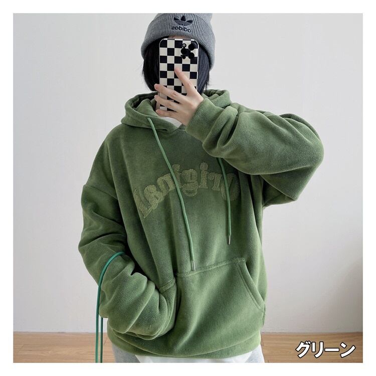 パーカー レディース トップス フード付き フーディー プルオーバー ボアパーカー ワンサイズ フリーサイズ グリーン 緑 ピンク アプリコット ブラック 黒 大人カラー くすみカラー もこもこ ふわふわ フリース ロゴ 英字 長袖 ポケット ストレート ショート丈 ミドル丈 ゆったり ゆる ルーズ ボーイッシュ メンズライク カジュアル ストリート ストカジ きれカジ シンプル ベーシック 大人 大人可愛い 定番 万能 着回し デイリー お出かけ 休日 防寒 あったか 学生 通学 韓国 オルチャン