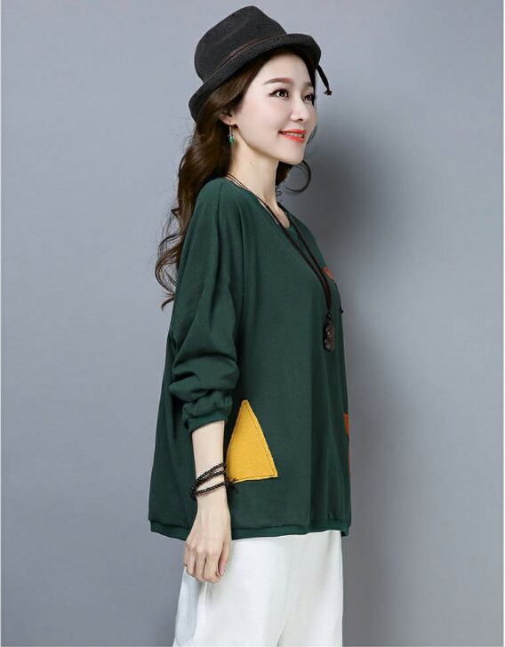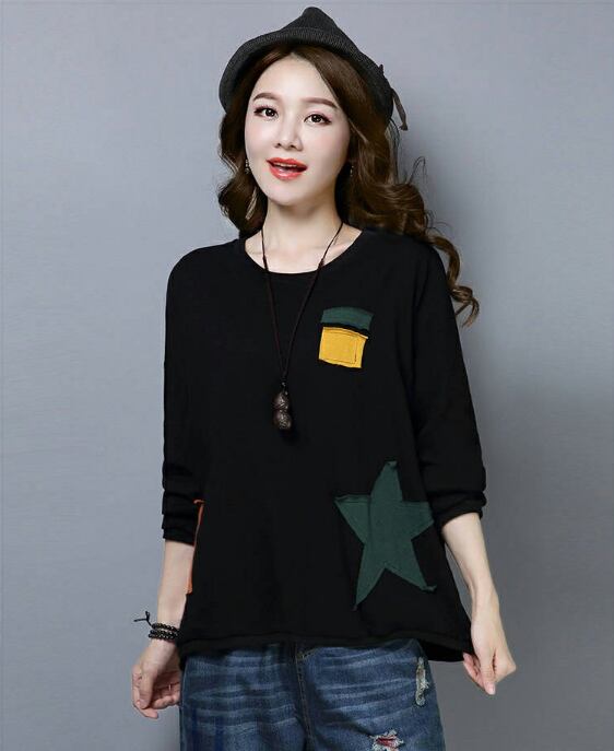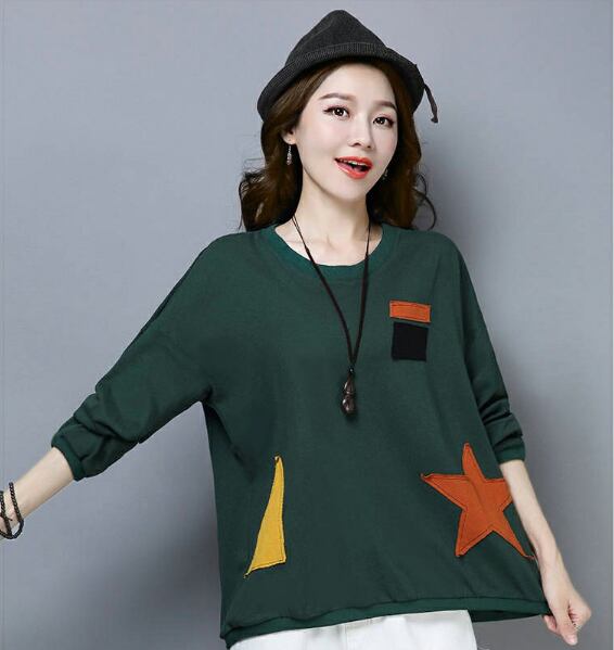 トップス カットソー プルオーバー 袖あり 長袖 ラウンドネック ワイド 大人可愛い カジュアル 大人 おしゃれ 大人女子 こなれ感 ラフ ルーズ 個性的 主役級 存在感 抜け感 アップリケ プリント スター柄 春 秋 10代 20代 30代 40代 50代 60代 レディース 女性用 デート お出かけ 公園デビュー 女子会 休日 旅行 着回し 普段使い 重ね着 韓国系 オルチャン ファッション コーデ スタイル 体系カバー XL 2XL 3XL 4XL 5XL ゆったり グリーン オレンジ ブラック