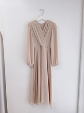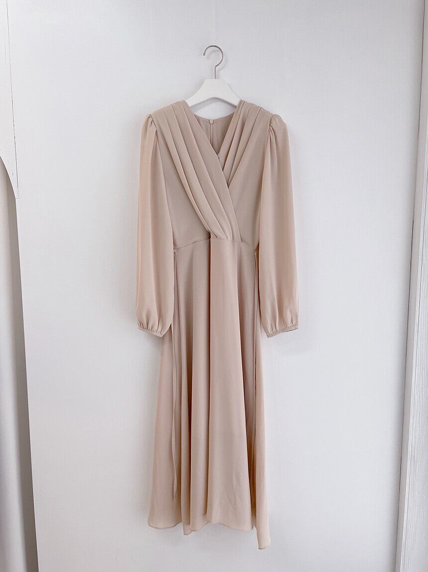 ワンピース ドレス Vネック 長袖 膝丈 ミモレ丈 レディース きれいめ 上品 エレガント 高級感 ロングワンピース タック Aライン 無地 パステルカラー くすみカラー ベージュ ブルー 水色 パフスリーブ お洒落 オシャレ かわいい 大人可愛い フェミニン フェアリー ガーリー 20代 30代 40代 シフォン ハイウエスト 脚長 美脚 スタイルアップ 結婚式 披露宴 二次会 普段使い 普段着 女子会 デート モテ 映え SNS ショッピング お出かけ