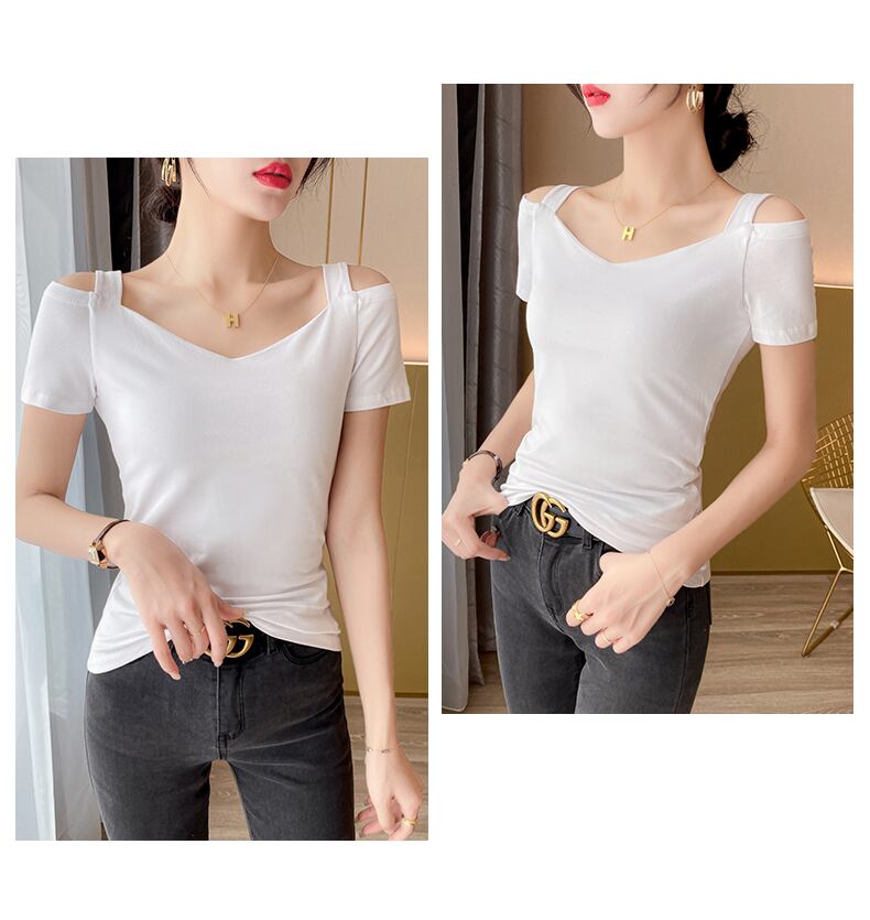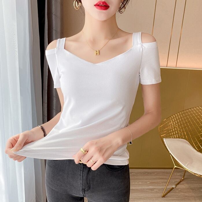 トップス シャツ カットソー オフショルダー ショート丈 半袖 レディース きれいめ エレガント タイト スリム 細身 大きいサイズ S М L XL 2XL お洒落 オシャレ かわいい 大人可愛い 20代 30代 40代 シンプル カジュアル 春 夏 こなれ感 休日 お出かけ 買い物 公園 女子会 モテ デート 着回し 薄手 抜け感 ホワイト 白 黒 ブラック 無地 個性派 個性的 ラフ こなれ感 Vネック セクシー 鎖骨 デコルテ 小顔 華奢 美脚 脚長 スタイルアップ 伸縮性