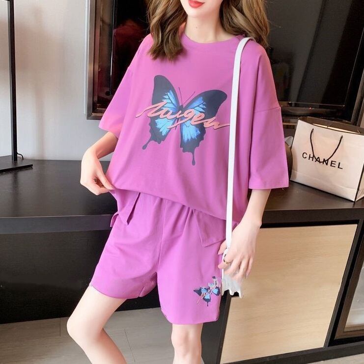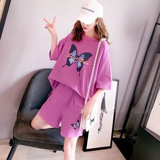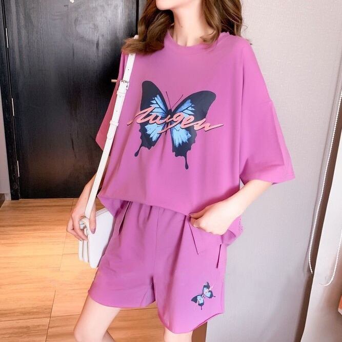 セットアップ 上下セット Tシャツ パンツ ゆったり 蝶 プリント レディース 2点セット ラウンドネック 半袖 5分袖 ウエストゴム 大きめ 大きいサイズ プラスサイズ М L XL 2XL 3XL 4XL ギャル お洒落 オシャレ かわいい 大人可愛い ルーズ こなれ感 シンプル カジュアル ラフ 体型カバー 着痩せ 膝下 春 夏 お得 お買い得 シャツ カットソー ズボン 着回し 普段着 普段使い ルームウェア 部屋着 パジャマ オーバーサイズ ドロップショルダー ハーフパンツ 楽ちん