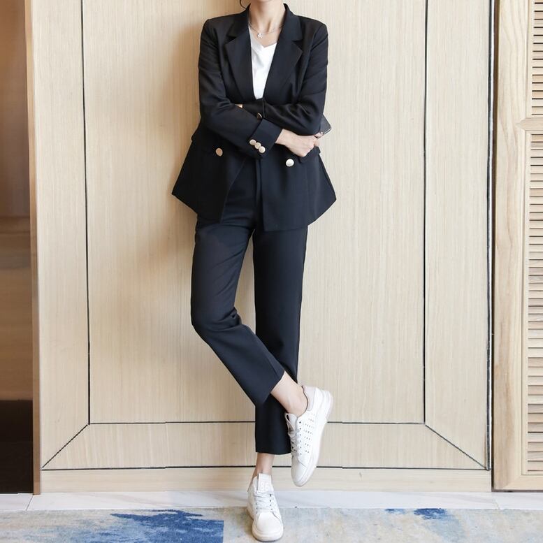 美しいシルエットの女性らしいベーシックなパンツスーツ