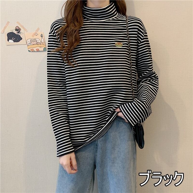 トップス ボーダー カットソー シャツ 4色 長袖 レディース シャツ ハイネック タートルネック ゆったり 大きめ シンプル カジュアル ラフ ストライプ ホワイト 白 黒 ブラック ベージュ ブラウン 茶色 くすみカラー ルーズ ゆる リラックス 部屋着 ルームウェア 萌え袖 休日 お出かけ 公園 体型カバー 着痩せ 細見え 20代 30代 40代 50代 60代 春 秋 冬 お洒落 オシャレ かわいい 大人可愛い こなれ感 大きめ М L XL 着回し 着心地 ドロップショルダー