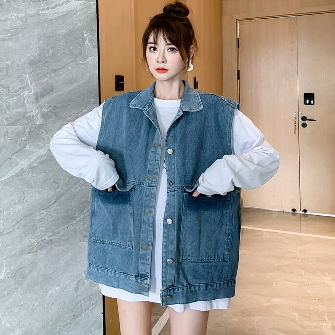 デニム ベスト ジャケット レディース 襟付き オーバーサイズ ノースリーブ プラスサイズ オシャレ お洒落 Iライン ストレート かわいい 大人可愛い 20代 30代 40代 着回し 重ね着 シンプル カジュアル ラフ ジレ チョッキ 無地 ブルー 青 ブリーチ 色落ち 体型カバー 着痩せ 細見え ゆったり 大きめ М L XL 2XL 3XL 4XL 大きいサイズ 春 秋 冬 抜け感 ルーズ こなれ感 休日 ショッピング 公園 買い物 前開き ポケット クール かっこいい ボーイッシュ ストリート