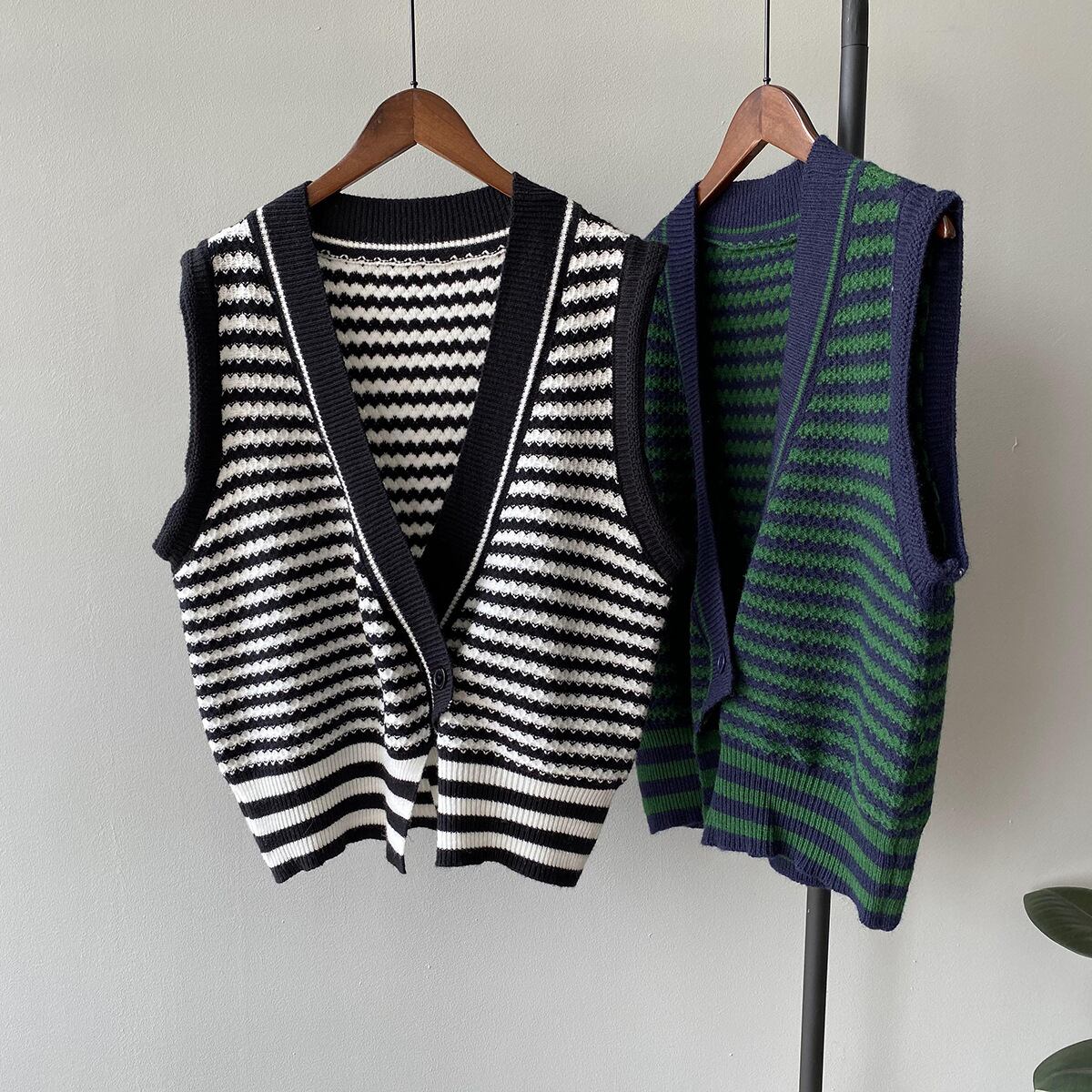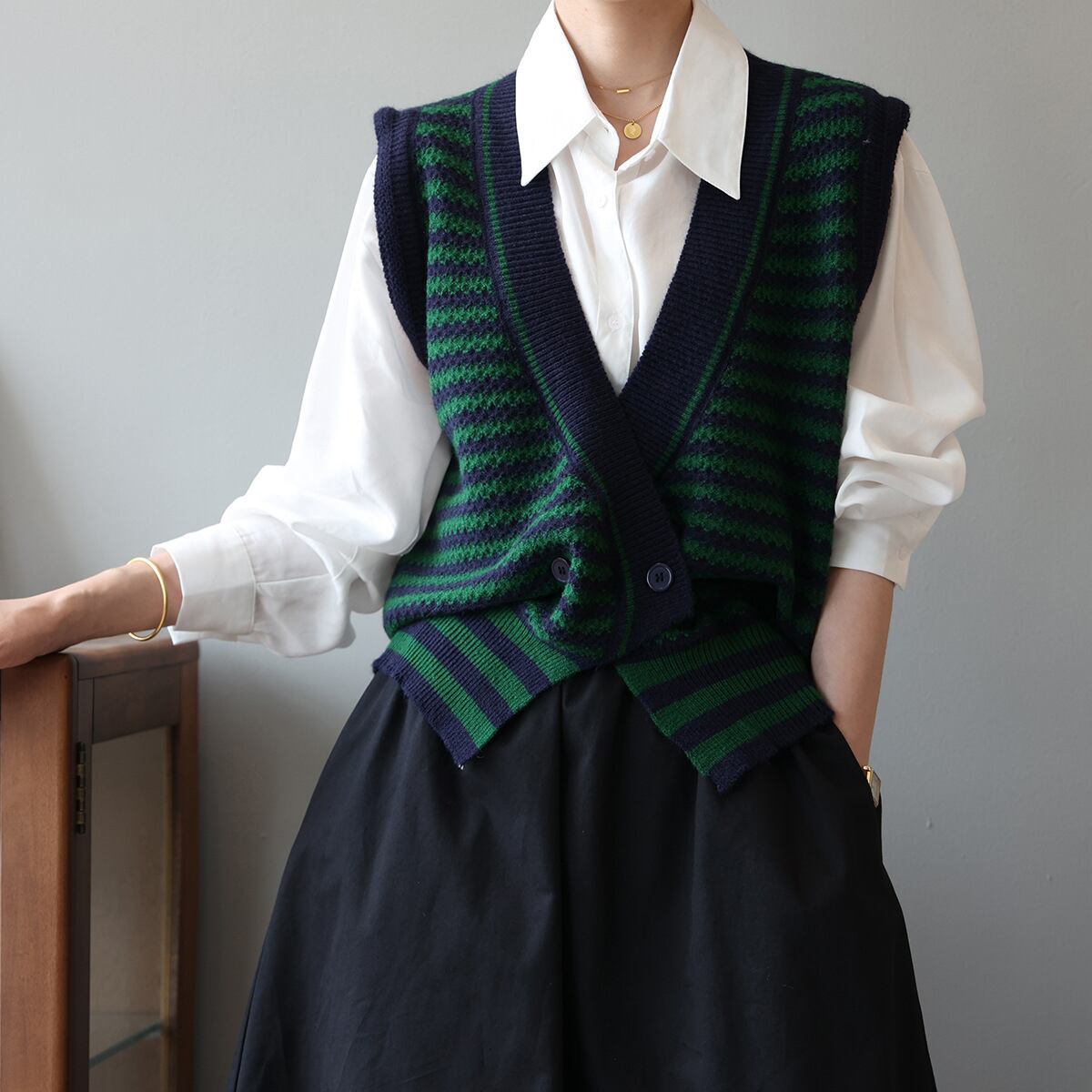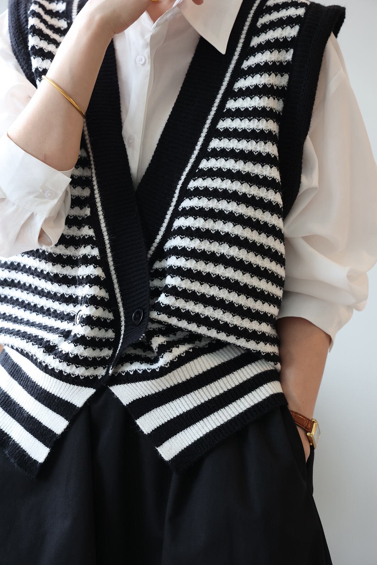 トップス ベスト ニット 前開き ボーダー バイカラー レディース Vネック ノースリーブ オシャレ お洒落 きれいめ 上品 エレガント かわいい 大人可愛い ガーリー 10代 20代 30代 40代 50代 着回し 重ね着 シンプル カジュアル ラフ ジレ チョッキ ベージュ ブラック 黒 グリーン 緑 ホワイト 白 華奢 細見え ゆったり 春 秋 冬 抜け感 こなれ感 レトロ アンティーク ヴィンテージ 韓国 トレンド 柔らか 個性的 個性派 普段使い 女子会 薄手 休日 ショッピング ストライプ