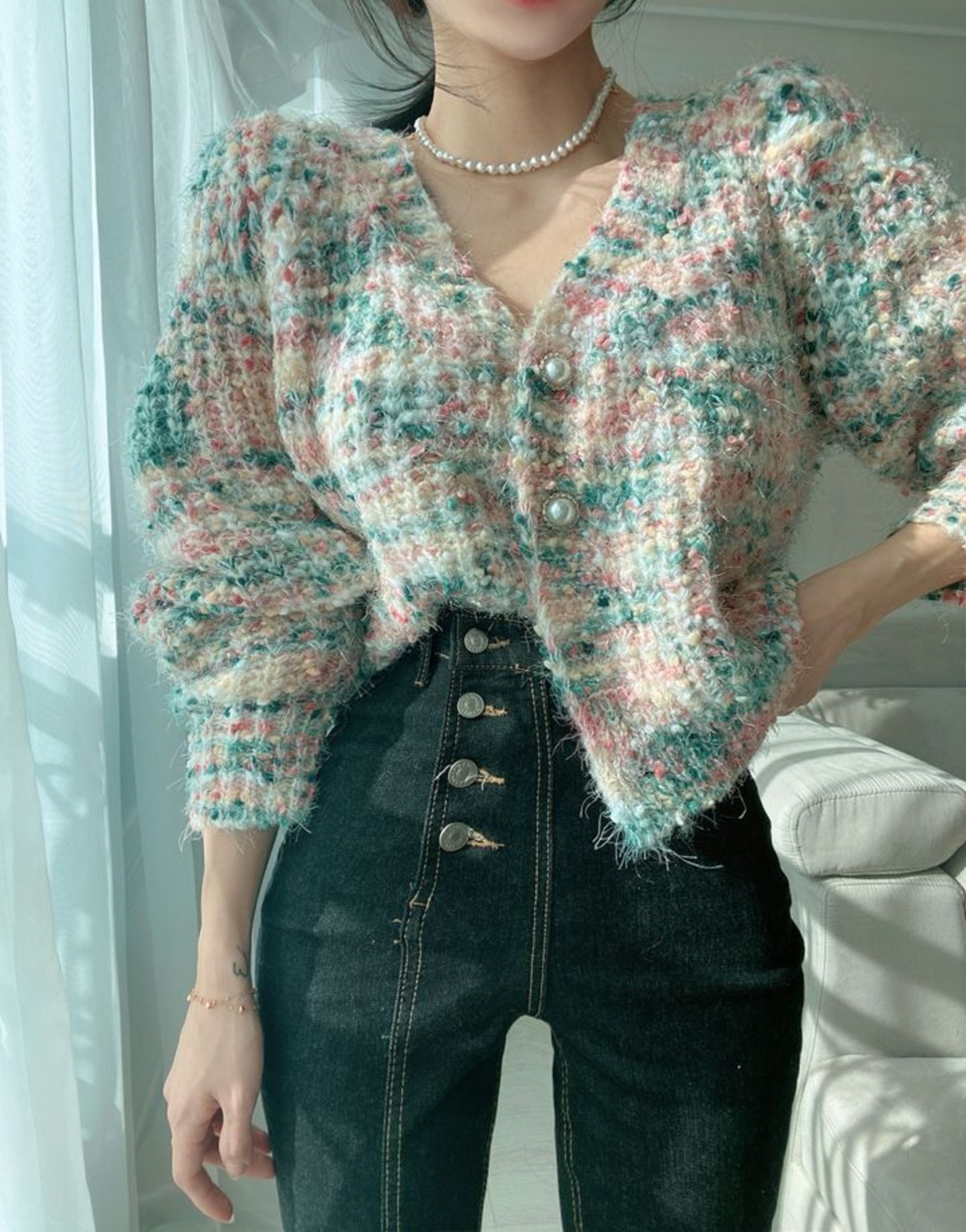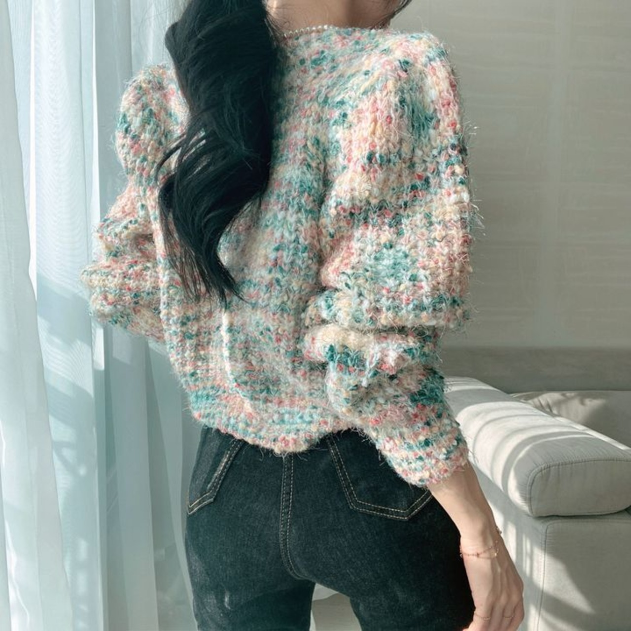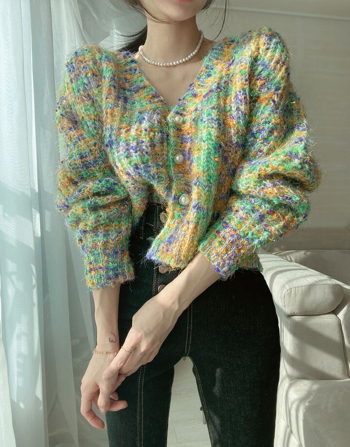 カラフルなツイード風のニットカーディガンです。